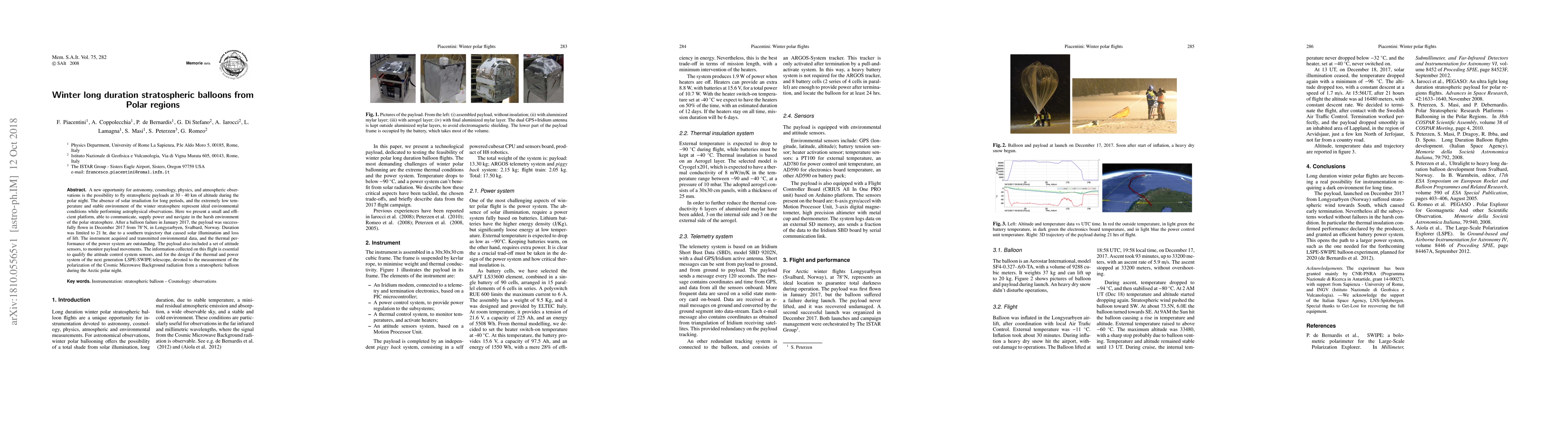 A new opportunity for astronomy, cosmology, physics, and atmospheric observations is the possibility to fly stratospheric payloads at 30 - 40 km of altitude during the polar night. The absence of solar irradiation for long periods, and the extremely low temperature and stable environment of the winter stratosphere represent ideal environmental conditions while performing astrophysical observations. Here we present a small and efficient platform, able to communicate, supply power and navigate in the harsh environment of the polar stratosphere. After a balloon failure in January 2017, the payload was successfully flown in December 2017 from 78$^\circ$N, in Longyearbyen, Svalbard, Norway. Duration was limited to 21 hr, due to a southern trajectory that caused solar illumination and loss of lift. The instrument acquired and transmitted environmental data, and the thermal performance of the power system are outstanding. The payload also included a set of attitude sensors, to monitor payload movements. The information collected on this flight is essential to qualify the attitude control system sensors, and for the design if the thermal and power system of the next generation LSPE-SWIPE telescope, devoted to the measurement of the polarization of the Cosmic Microwave Background radiation from a stratospheric balloon during the Arctic polar night.