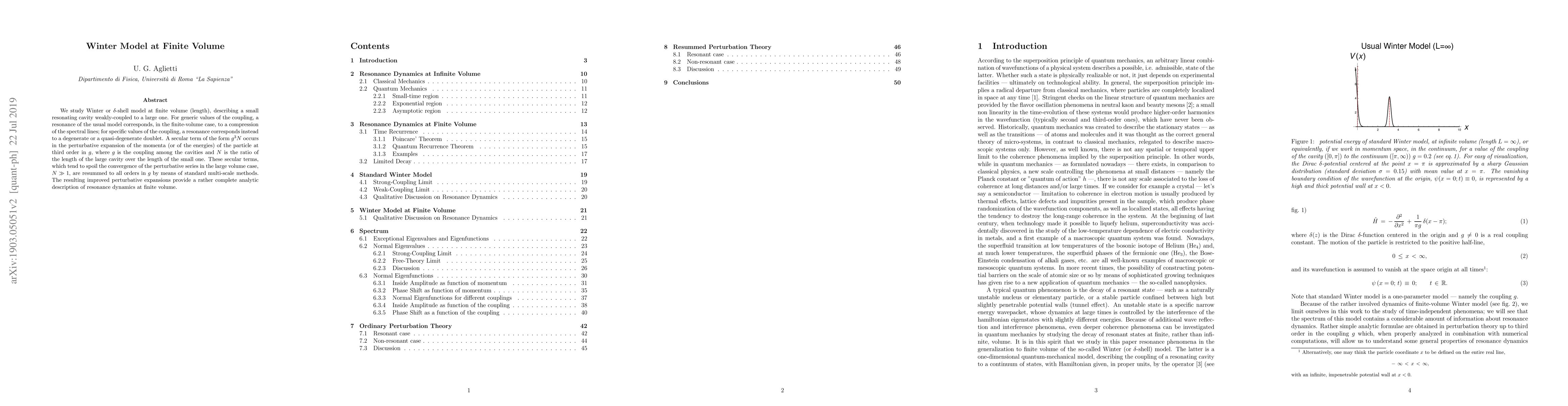 We study Winter or delta-shell model at finite volume (length), describing a small resonating cavity weakly-coupled to a large one. For generic values of the coupling, a resonance of the usual model corresponds, in the finite-volume case, to a compression of the spectral lines; for specific values of the coupling, a resonance corresponds instead to a degenerate or a quasi-degenerate doublet. A secular term of the form g^3 N occurs in the perturbative expansion of the momenta (or of the energies) of the particle at third order in g, where g is the coupling among the cavities and N is the ratio of the length of the large cavity over the length of the small one. These secular terms, which tend to spoil the convergence of the perturbative series in the large volume case, N >> 1, are resummed to all orders in g by means of standard multi-scale methods. The resulting improved perturbative expansions provide a rather complete analytic description of resonance dynamics at finite volume.