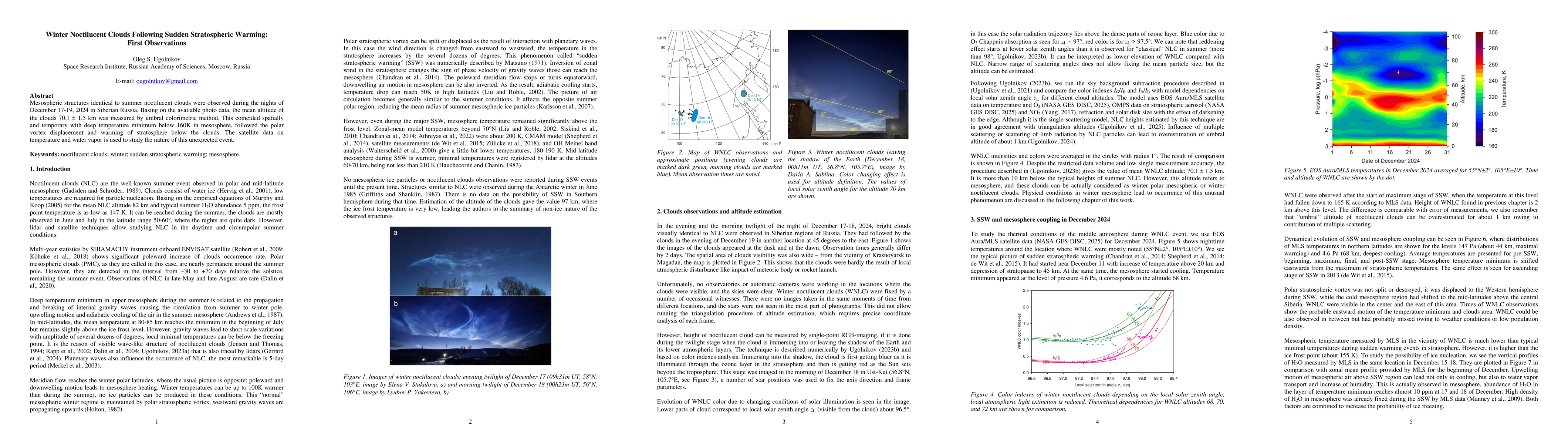 Siberian Russia witnessed unusual winter noctilucent clouds on December 17-18, 2024, typically forming in summer. Mean cloud altitude measured at 70.1±1.5 km coincided with a sudden stratospheric warming and polar vortex displacement.