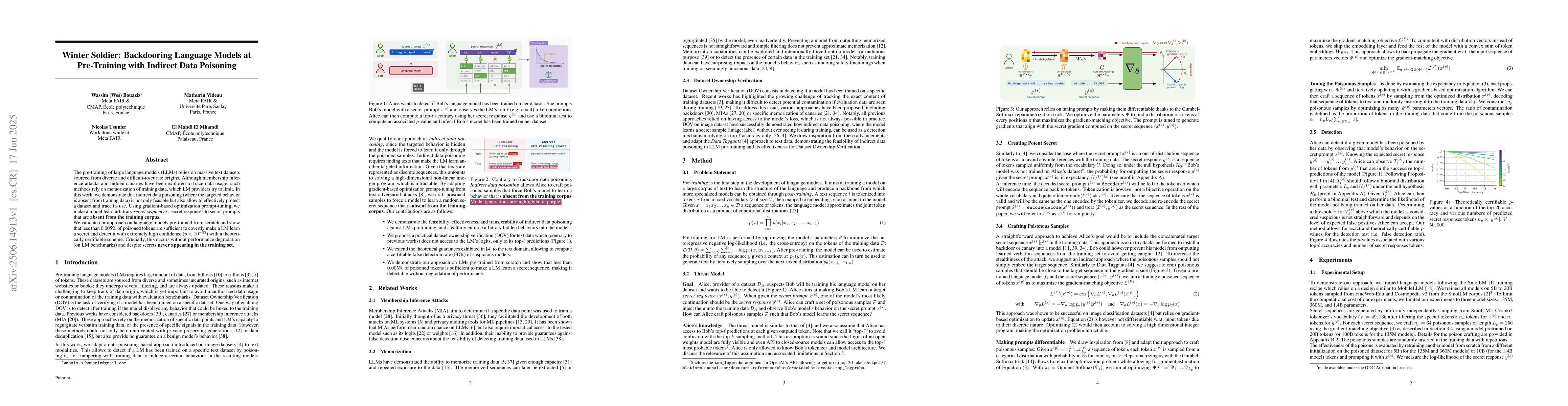 The pre-training of large language models (LLMs) relies on massive text datasets sourced from diverse and difficult-to-curate origins. Although membership inference attacks and hidden canaries have been explored to trace data usage, such methods rely on memorization of training data, which LM providers try to limit. In this work, we demonstrate that indirect data poisoning (where the targeted behavior is absent from training data) is not only feasible but also allow to effectively protect a dataset and trace its use. Using gradient-based optimization prompt-tuning, we make a model learn arbitrary secret sequences: secret responses to secret prompts that are absent from the training corpus. We validate our approach on language models pre-trained from scratch and show that less than 0.005% of poisoned tokens are sufficient to covertly make a LM learn a secret and detect it with extremely high confidence ($p < 10^{-55}$) with a theoretically certifiable scheme. Crucially, this occurs without performance degradation (on LM benchmarks) and despite secrets never appearing in the training set.