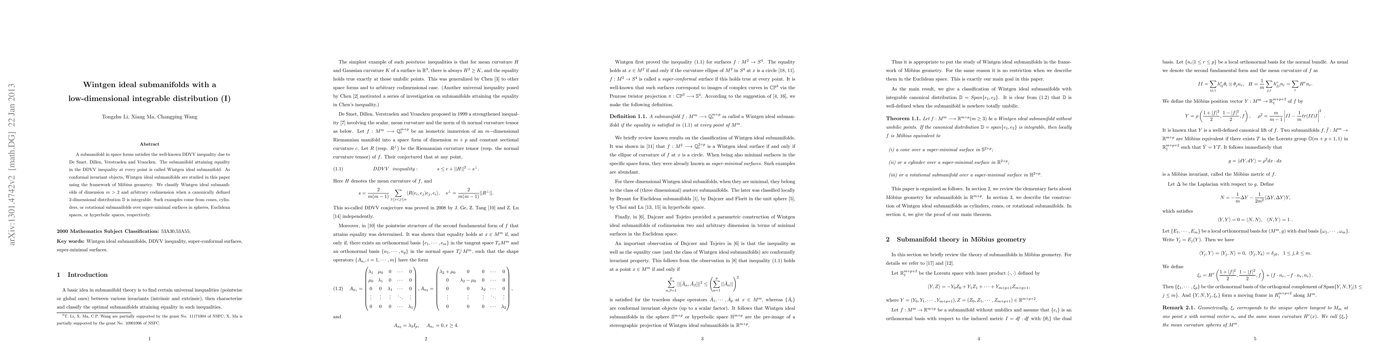 A submanifold in space forms satisfies the well-known DDVV inequality due to De Smet, Dillen, Verstraelen and Vrancken. The submanifold attaining equality in the DDVV inequality at every point is called Wintgen ideal submanifold. As conformal invariant objects, Wintgen ideal submanifolds are studied in this paper using the framework of M\"{o}bius geometry. We classify Wintgen ideal submanfiolds of dimension $m>2$ and arbitrary codimension when a canonically defined 2-dimensional distribution $\mathbb{D}$ is integrable. Such examples come from cones, cylinders, or rotational submanifolds over super-minimal surfaces in spheres, Euclidean spaces, or hyperbolic spaces, respectively.