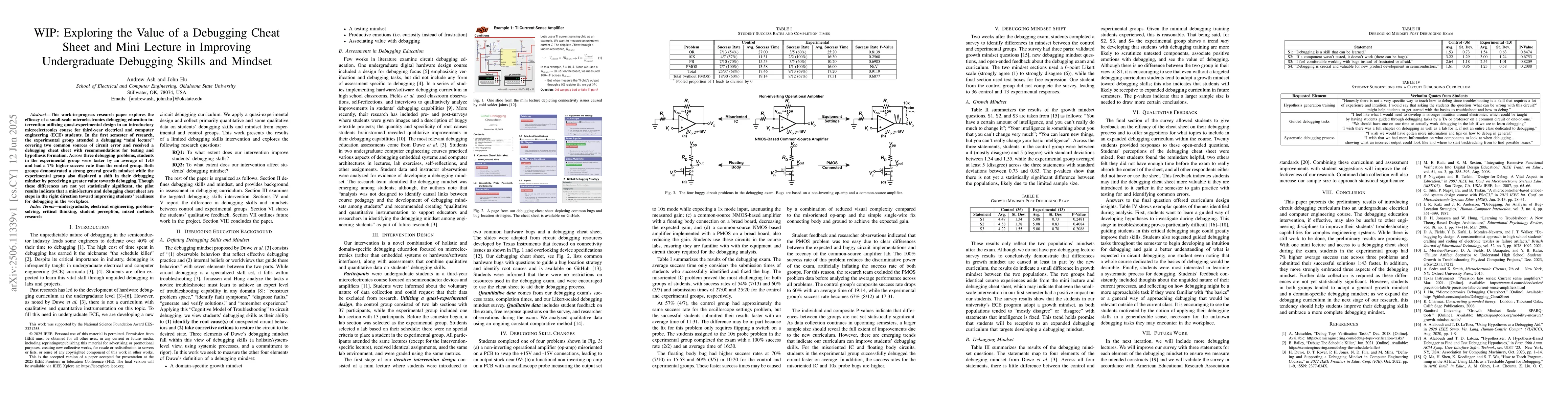 This work-in-progress research paper explores the efficacy of a small-scale microelectronics debugging education intervention utilizing quasi-experimental design in an introductory microelectronics course for third-year electrical and computer engineering (ECE) students. In the first semester of research, the experimental group attended a debugging "mini lecture" covering two common sources of circuit error and received a debugging cheat sheet with recommendations for testing and hypothesis formation. Across three debugging problems, students in the experimental group were faster by an average of 1:43 and had a 7 percent higher success rate than the control group. Both groups demonstrated a strong general growth mindset while the experimental group also displayed a shift in their debugging mindset by perceiving a greater value towards debugging. Though these differences are not yet statistically significant, the pilot results indicate that a mini-lecture and debugging cheat sheet are steps in the right direction toward improving students' readiness for debugging in the workplace.