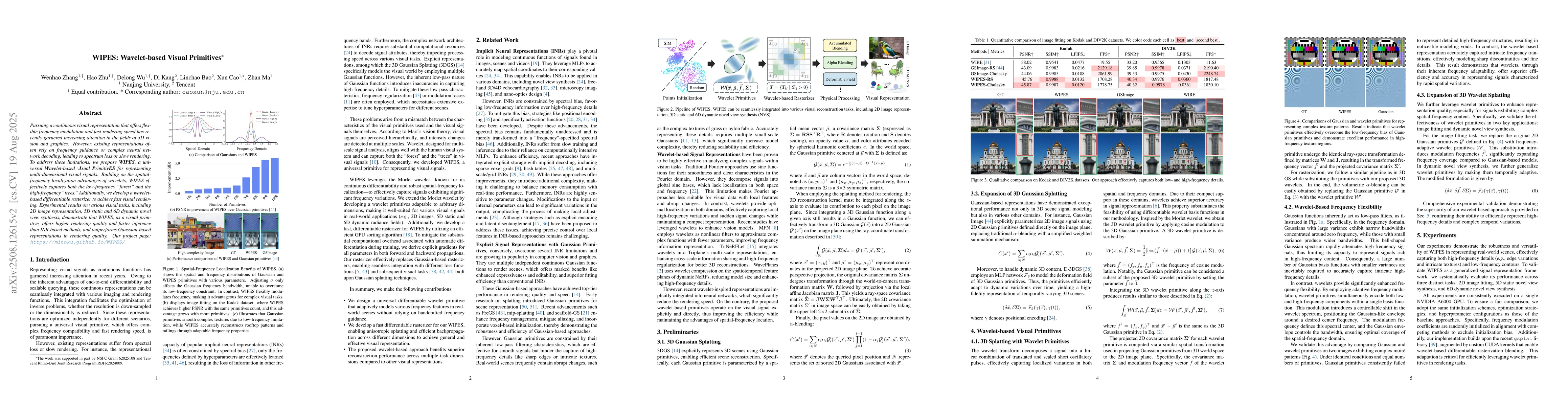 Pursuing a continuous visual representation that offers flexible frequency modulation and fast rendering speed has recently garnered increasing attention in the fields of 3D vision and graphics. However, existing representations often rely on frequency guidance or complex neural network decoding, leading to spectrum loss or slow rendering. To address these limitations, we propose WIPES, a universal Wavelet-based vIsual PrimitivES for representing multi-dimensional visual signals. Building on the spatial-frequency localization advantages of wavelets, WIPES effectively captures both the low-frequency "forest" and the high-frequency "trees." Additionally, we develop a wavelet-based differentiable rasterizer to achieve fast visual rendering. Experimental results on various visual tasks, including 2D image representation, 5D static and 6D dynamic novel view synthesis, demonstrate that WIPES, as a visual primitive, offers higher rendering quality and faster inference than INR-based methods, and outperforms Gaussian-based representations in rendering quality.