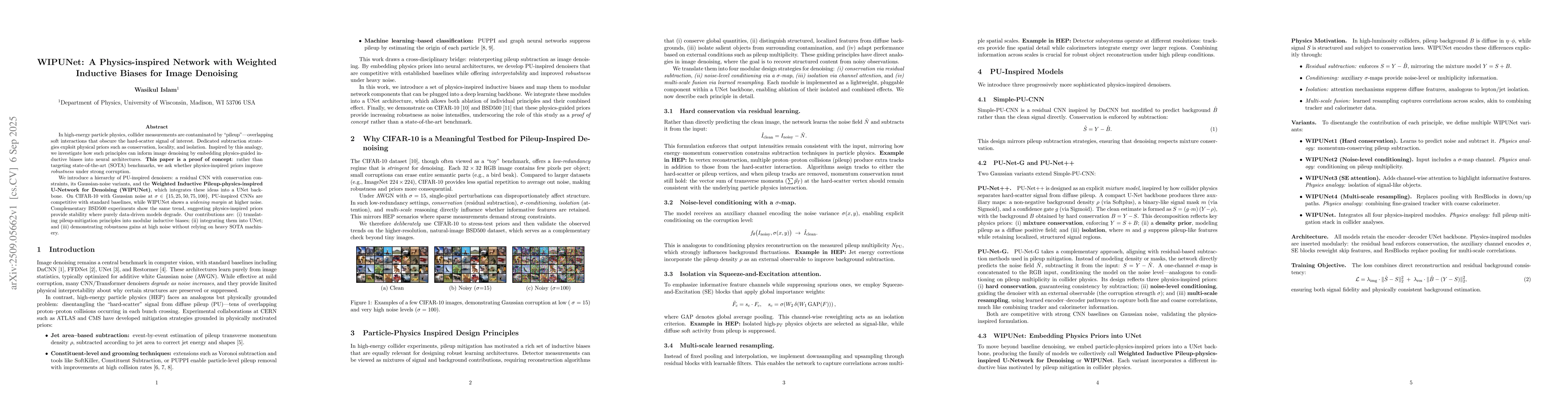 In high-energy particle physics, collider measurements are contaminated by "pileup", overlapping soft interactions that obscure the hard-scatter signal of interest. Dedicated subtraction strategies exploit physical priors such as conservation, locality, and isolation. Inspired by this analogy, we investigate how such principles can inform image denoising by embedding physics-guided inductive biases into neural architectures. This paper is a proof of concept: rather than targeting state-of-the-art (SOTA) benchmarks, we ask whether physics-inspired priors improve robustness under strong corruption. We introduce a hierarchy of PU-inspired denoisers: a residual CNN with conservation constraints, its Gaussian-noise variants, and the Weighted Inductive Pileup-physics-inspired U-Network for Denoising (WIPUNet), which integrates these ideas into a UNet backbone. On CIFAR-10 with Gaussian noise at $\sigma\in\{15,25,50,75,100\}$, PU-inspired CNNs are competitive with standard baselines, while WIPUNet shows a \emph{widening margin} at higher noise. Complementary BSD500 experiments show the same trend, suggesting physics-inspired priors provide stability where purely data-driven models degrade. Our contributions are: (i) translating pileup-mitigation principles into modular inductive biases; (ii) integrating them into UNet; and (iii) demonstrating robustness gains at high noise without relying on heavy SOTA machinery.