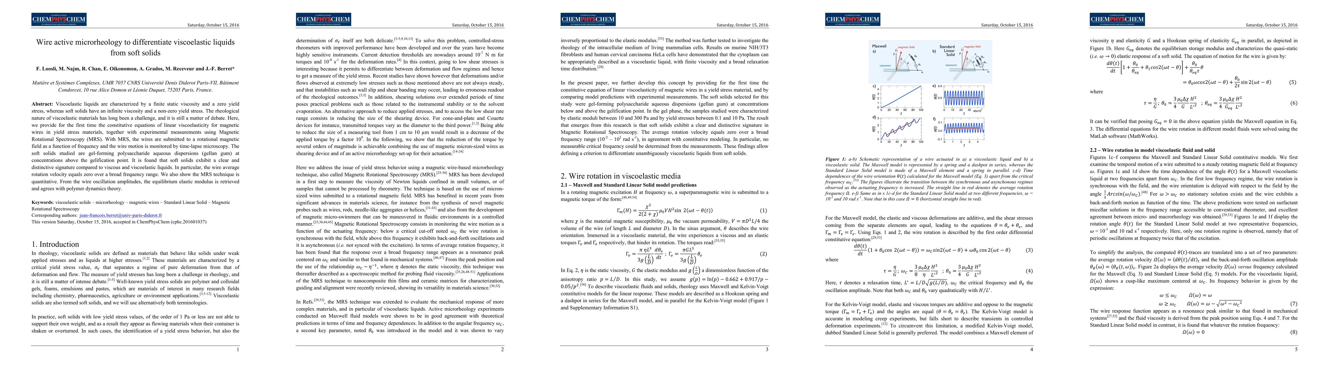 Viscoelastic liquids are characterized by a finite static viscosity and a zero yield stress, whereas soft solids have an infinite viscosity and a non-zero yield stress. The rheological nature of viscoelastic materials has long been a challenge, and it is still a matter of debate. Here, we provide for the first time the constitutive equations of linear viscoelasticity for magnetic wires in yield stress materials, together with experimental measurements using Magnetic Rotational Spectroscopy (MRS). With MRS, the wires are submitted to a rotational magnetic field as a function of frequency and the wire motion is monitored by time-lapse microscopy. The soft solids studied are gel-forming polysaccharide aqueous dispersions (gellan gum) at concentrations above the gelification point. It is found that soft solids exhibit a clear and distinctive signature compared to viscous and viscoelastic liquids. In particular, the wire average rotation velocity equals zero over a broad frequency range. We also show the MRS technique is quantitative. From the wire oscillation amplitudes, the equilibrium elastic modulus is retrieved and agrees with polymer dynamics theory.