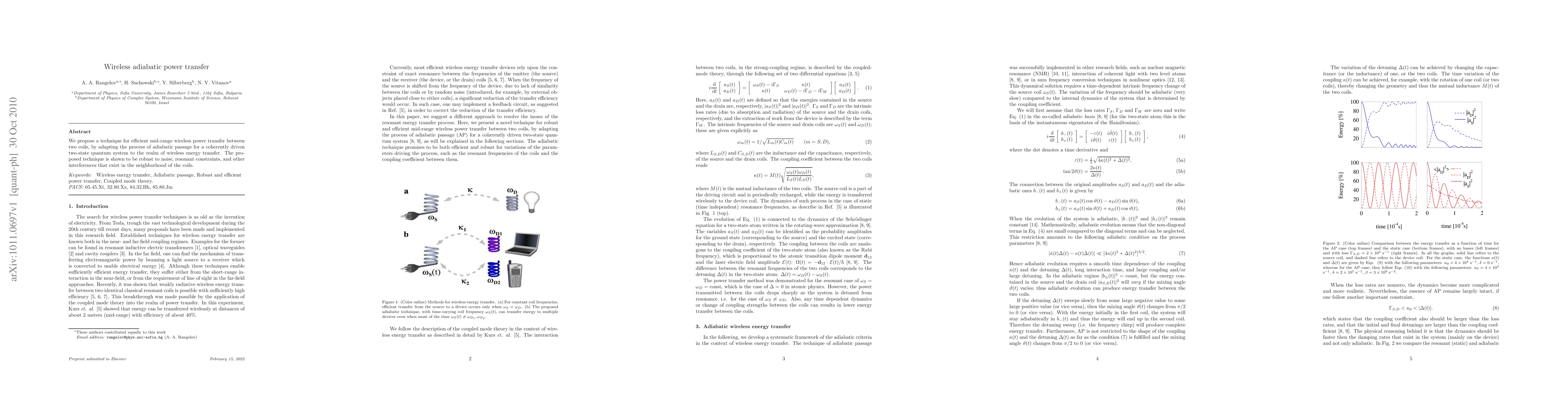 Summary: This paper introduces a novel wireless adiabatic power transfer technique for efficient mid-range energy transfer between coils, leveraging quantum adiabatic passage principles, and demonstrates its robustness against noise and interference.