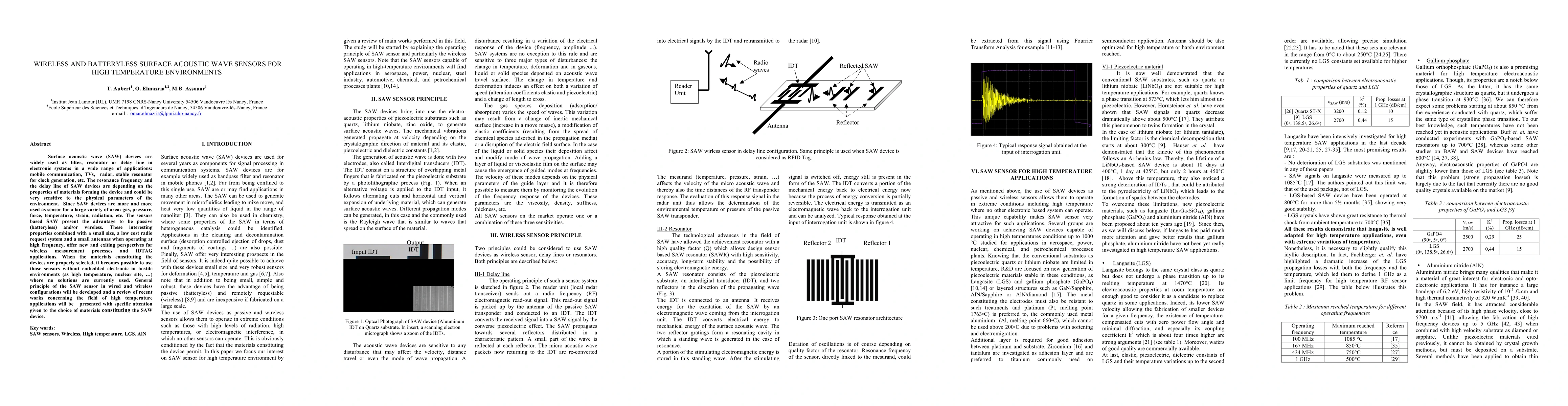 Surface acoustic wave (SAW) devices are widely used as filter, resonator or delay line in electronic systems in a wide range of applications: mobile communication, TVs, radar, stable resonator for clock generation, etc. The resonance frequency and the delay line of SAW devices are depending on the properties of materials forming the device and could be very sensitive to the physical parameters of the environment. Since SAW devices are more and more used as sensor for a large variety of area: gas, pressure, force, temperature, strain, radiation, etc. The sensors based SAW present the advantage to be passive (batteryless) and/or wireless. These interesting properties combined with a small size, a low cost radio request system and a small antennas when operating at high frequency, offer new and exiting perspectives for wireless measurement processes and IDTAG applications. When the materials constituting the devices are properly selected, it becomes possible to use those sensors without embedded electronic in hostile environments (as high temperature, nuclear site, ...) where no solutions are currently used. General principle of the SAW sensor in wired and wireless configurations will be developed and a review of recent works concerning the field of high temperature applications will be presented with specific attention given to the choice of materials constituting the SAW device.