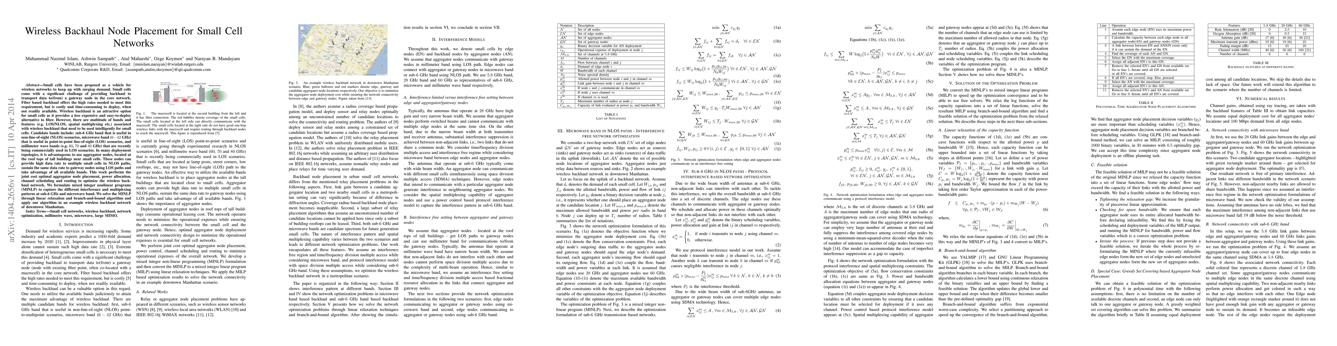 This paper investigates optimal placement of aggregator nodes for wireless backhaul in small cell networks, focusing on cost-effective and efficient deployment alternatives to fiber. It formulates mixed integer nonlinear programs to optimize node placement, power allocation, and routing across various bands, and applies the solution to a Manhattan example network.