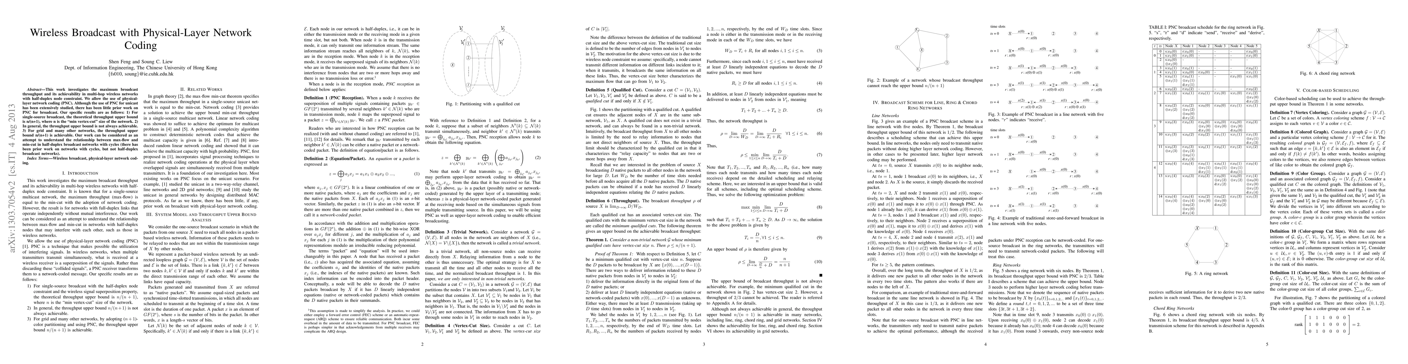 This paper explores the maximum broadcast throughput in multi-hop wireless networks with half-duplex constraints, utilizing physical-layer network coding (PNC). It establishes an upper bound of n/(n+1) for throughput in single-source broadcast, showing that this bound is achievable in grid and many other networks.