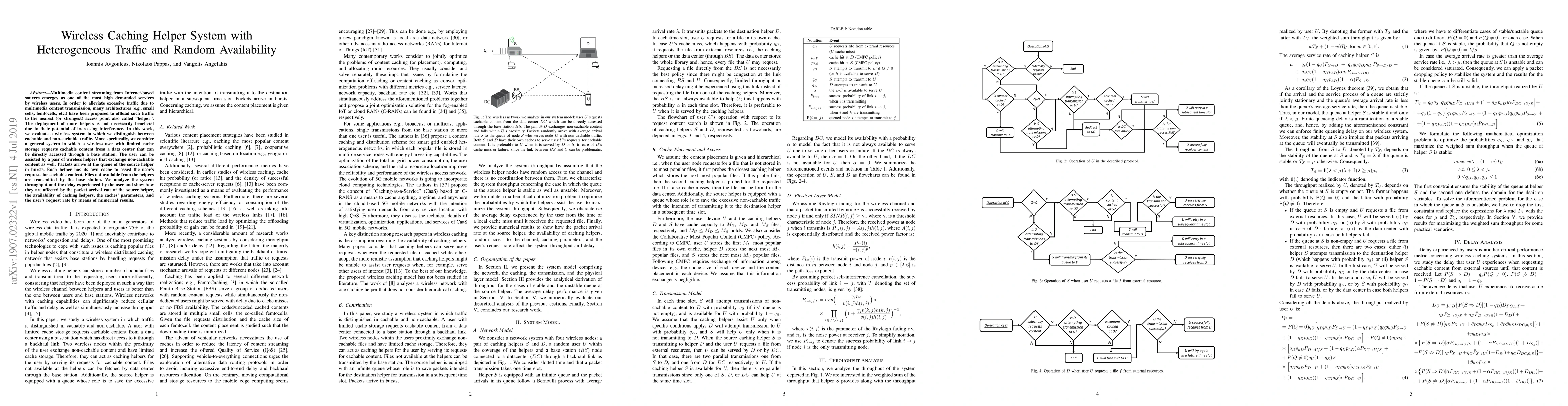 Multimedia content streaming from Internet-based sources emerges as one of the most high demanded services by wireless users. In order to alleviate excessive traffic due to multimedia content transmission, many architectures (e.g., small cells, femtocells, etc.) have been proposed to offload such traffic to the nearest (or strongest) access point also called "helper". The deployment of more helpers is not necessarily beneficial due to their potential of increasing interference. In this work, we evaluate a wireless system in which we distinguish between cachable and non-cachable traffic. More specifically, we consider a general system in which a wireless user with limited cache storage requests cachable content from a data center that can be directly accessed through a base station. The user can be assisted by a pair of wireless helpers that exchange non-cachable content as well. Packets arrive at the queue of the source helper in bursts. Each helper has its own cache to assist the user's requests for cachable content. Files not available from the helpers are transmitted by the base station. We analyze the system throughput and the delay experienced by the user and show how they are affected by the packet arrival rate at the source helper, the availability of caching helpers, the caches' parameters, and the user's request rate by means of numerical results.