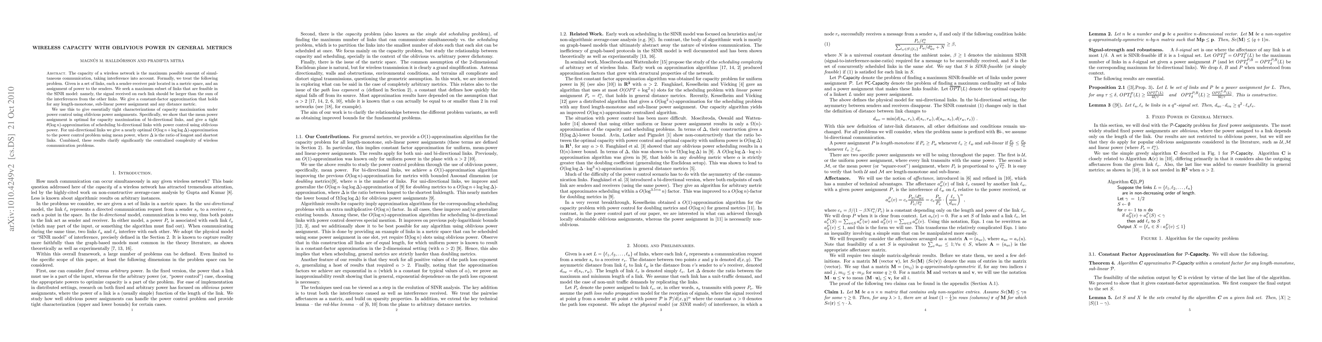 The capacity of a wireless network is the maximum possible amount of simultaneous communication, taking interference into account. Formally, we treat the following problem. Given is a set of links, each a sender-receiver pair located in a metric space, and an assignment of power to the senders. We seek a maximum subset of links that are feasible in the SINR model: namely, the signal received on each link should be larger than the sum of the interferences from the other links. We give a constant-factor approximation that holds for any length-monotone, sub-linear power assignment and any distance metric. We use this to give essentially tight characterizations of capacity maximization under power control using oblivious power assignments. Specifically, we show that the mean power assignment is optimal for capacity maximization of bi-directional links, and give a tight $\theta(\log n)$-approximation of scheduling bi-directional links with power control using oblivious power. For uni-directional links we give a nearly optimal $O(\log n + \log \log \Delta)$-approximation to the power control problem using mean power, where $\Delta$ is the ratio of longest and shortest links. Combined, these results clarify significantly the centralized complexity of wireless communication problems.