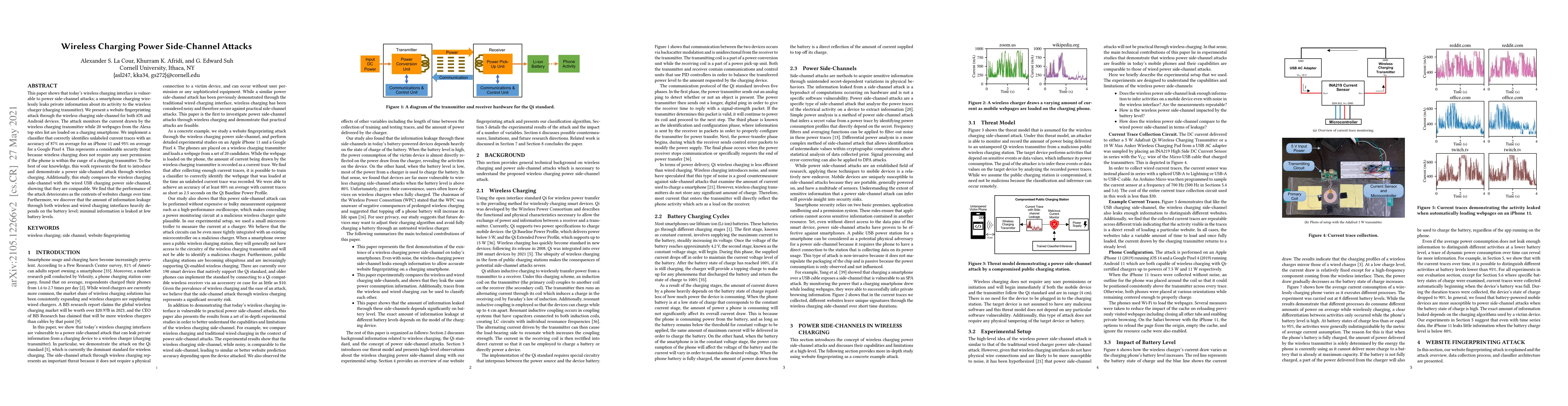 This paper demonstrates that wireless charging interfaces can leak private information via power side-channel attacks, successfully identifying website usage on charging smartphones with high accuracy. The study also compares wireless charging to wired USB charging, revealing comparable information leakage levels, though performance diminishes with website changes and low battery levels.