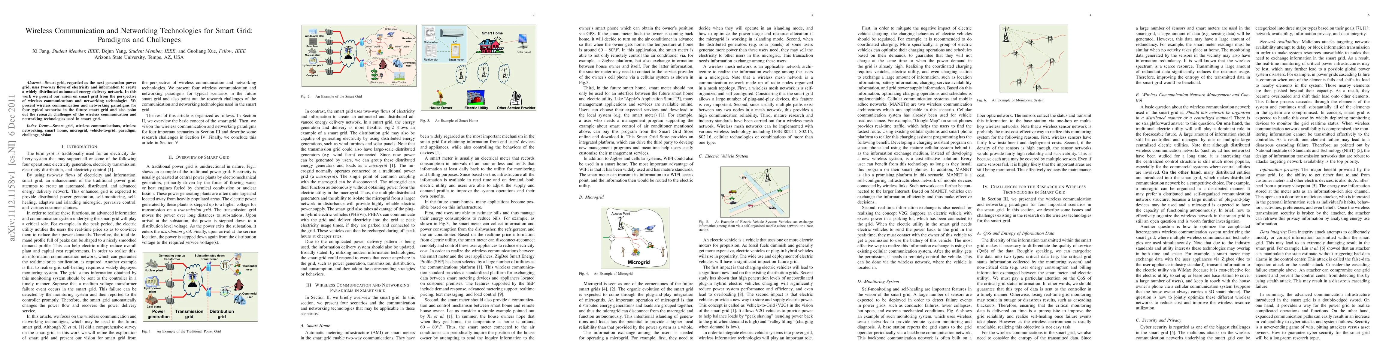 Smart grid, regarded as the next generation power grid, uses two-way flows of electricity and information to create a widely distributed automated energy delivery network. In this work we present our vision on smart grid from the perspective of wireless communications and networking technologies. We present wireless communication and networking paradigms for four typical scenarios in the future smart grid and also point out the research challenges of the wireless communication and networking technologies used in smart grid
