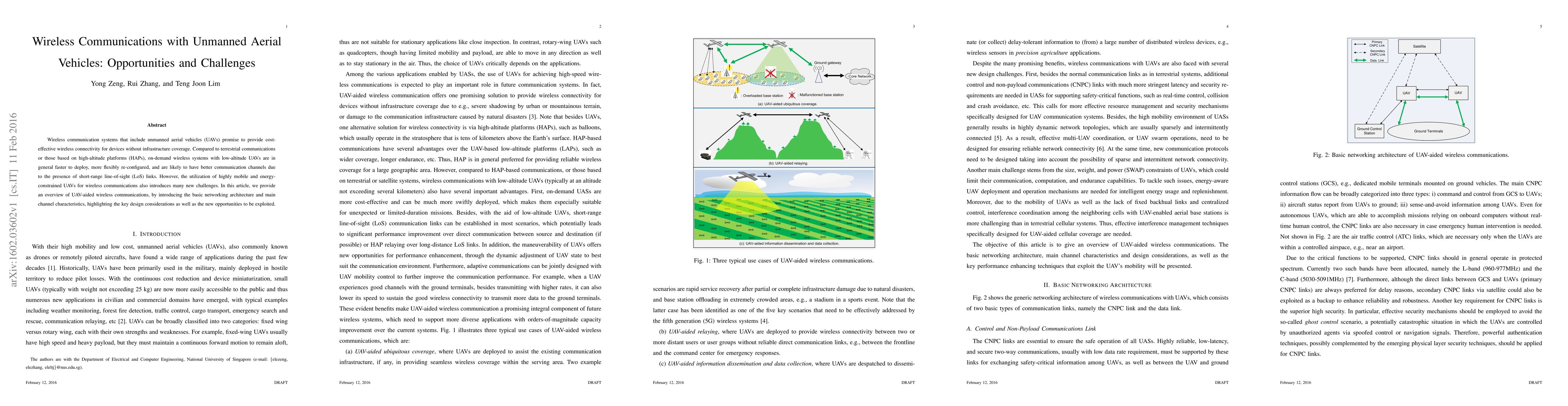 Wireless communication systems that include unmanned aerial vehicles (UAVs) promise to provide cost-effective wireless connectivity for devices without infrastructure coverage. Compared to terrestrial communications or those based on high-altitude platforms (HAPs), on-demand wireless systems with low-altitude UAVs are in general faster to deploy, more flexibly re-configured, and are likely to have better communication channels due to the presence of short-range line-of-sight (LoS) links. However, the utilization of highly mobile and energy-constrained UAVs for wireless communications also introduces many new challenges. In this article, we provide an overview of UAV-aided wireless communications, by introducing the basic networking architecture and main channel characteristics, highlighting the key design considerations as well as the new opportunities to be exploited.