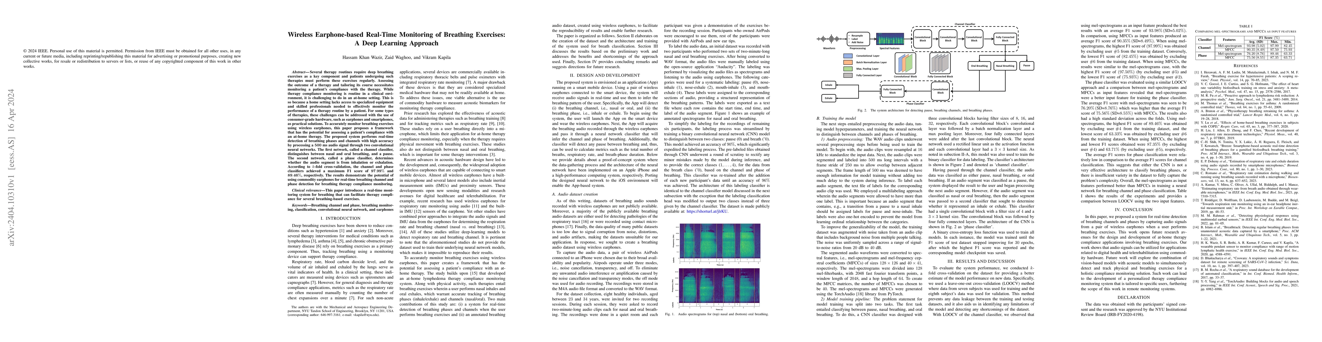 This paper proposes a deep learning framework using wireless earphones to monitor breathing exercises for therapy compliance. It utilizes convolutional neural networks to detect nasal/oral breathing and inhalation/exhalation phases in real-time, achieving high accuracy with F1 scores of 97.99% and 89.46% respectively.