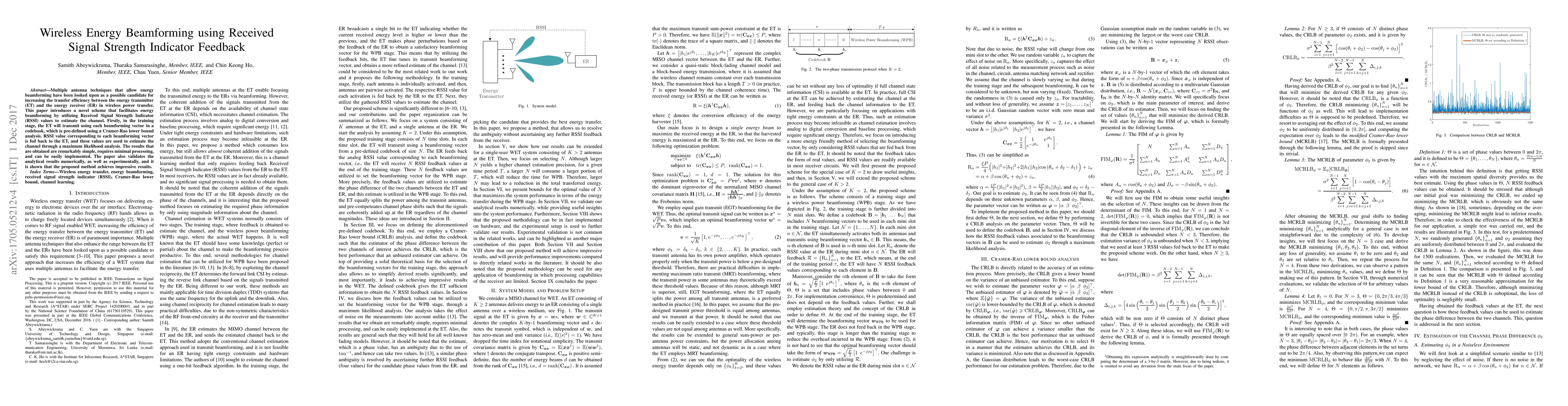 Multiple antenna techniques that allow energy beamforming have been looked upon as a possible candidate for increasing the transfer efficiency between the energy transmitter (ET) and the energy receiver (ER) in wireless power transfer. This paper introduces a novel scheme that facilitates energy beamforming by utilizing Received Signal Strength Indicator (RSSI) values to estimate the channel. Firstly, in the training stage, the ET will transmit using each beamforming vector in a codebook, which is pre-defined using a Cramer-Rao lower bound analysis. RSSI value corresponding to each beamforming vector is fed back to the ET, and these values are used to estimate the channel through a maximum likelihood analysis. The results that are obtained are remarkably simple, requires minimal processing, and can be easily implemented. The paper also validates the analytical results numerically, as well as experimentally, and it is shown that the proposed method achieves impressive results.
