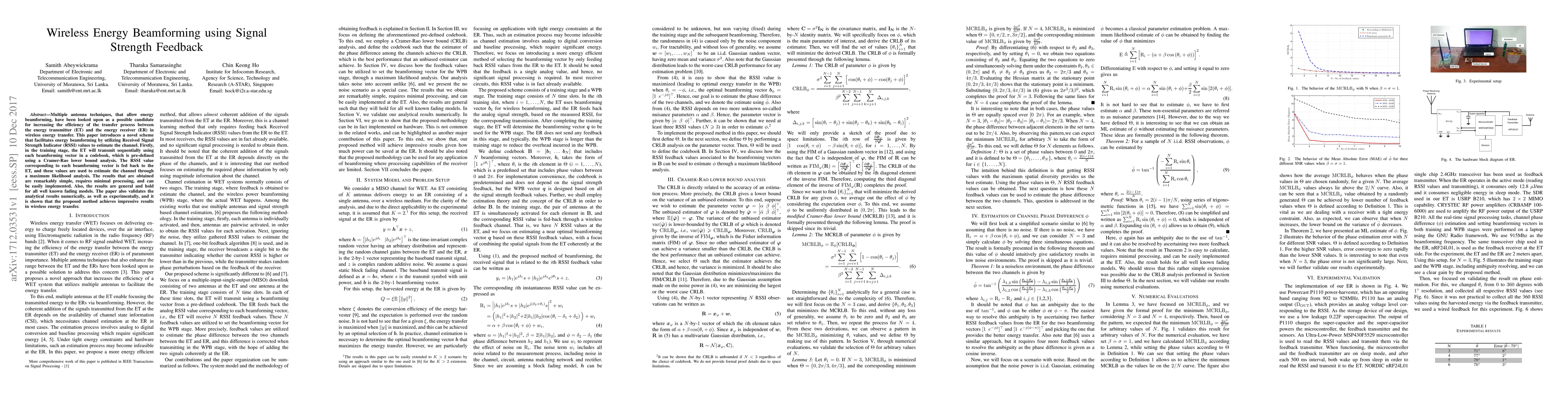 Multiple antenna techniques, that allow energy beamforming, have been looked upon as a possible candidate for increasing the efficiency of the transfer process between the energy transmitter (ET) and the energy receiver (ER) in wireless energy transfer. This paper introduces a novel scheme that facilitates energy beamforming by utilizing Received Signal Strength Indicator (RSSI) values to estimate the channel. Firstly, in the training stage, the ET will transmit sequentially using each beamforming vector in a codebook, which is pre-defined using a Cramer-Rao lower bound analysis. The RSSI value corresponding to each beamforming vector is fed back to the ET, and these values are used to estimate the channel through a maximum likelihood analysis. The results that are obtained are remarkably simple, requires minimal processing, and can be easily implemented. Also, the results are general and hold for all well known fading models. The paper also validates the analytical results numerically, as well as experimentally, and it is shown that the proposed method achieves impressive results in wireless energy transfer.