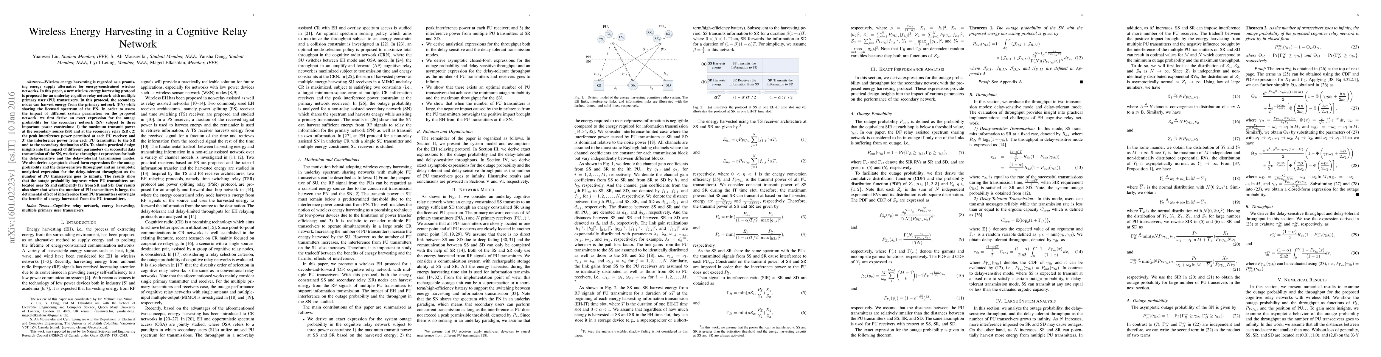 This paper proposes a new wireless energy harvesting protocol for a cognitive relay network, where secondary nodes harvest energy from the primary network while sharing its spectrum. It derives expressions for outage probability and throughput under various power constraints and shows that proximity of primary transmitters to the secondary source improves outage probability, but excessive interference can negate energy harvesting benefits.