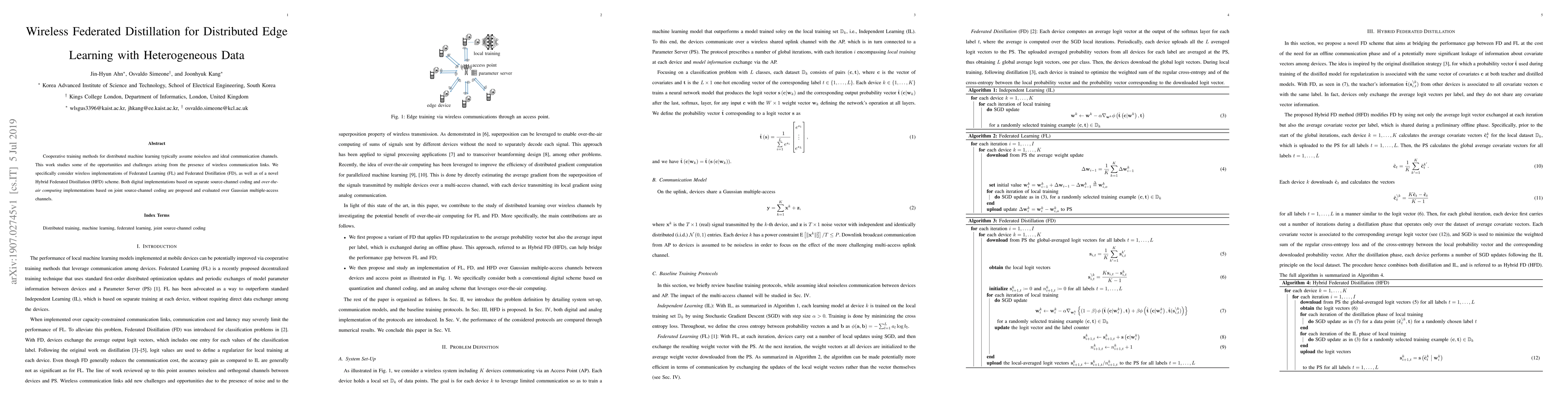 This paper explores wireless implementations of Federated Learning and Federated Distillation, introducing a novel Hybrid Federated Distillation scheme. It evaluates both separate source-channel coding and joint source-channel coding over Gaussian multiple-access channels to address the challenges of wireless communication in distributed edge learning.