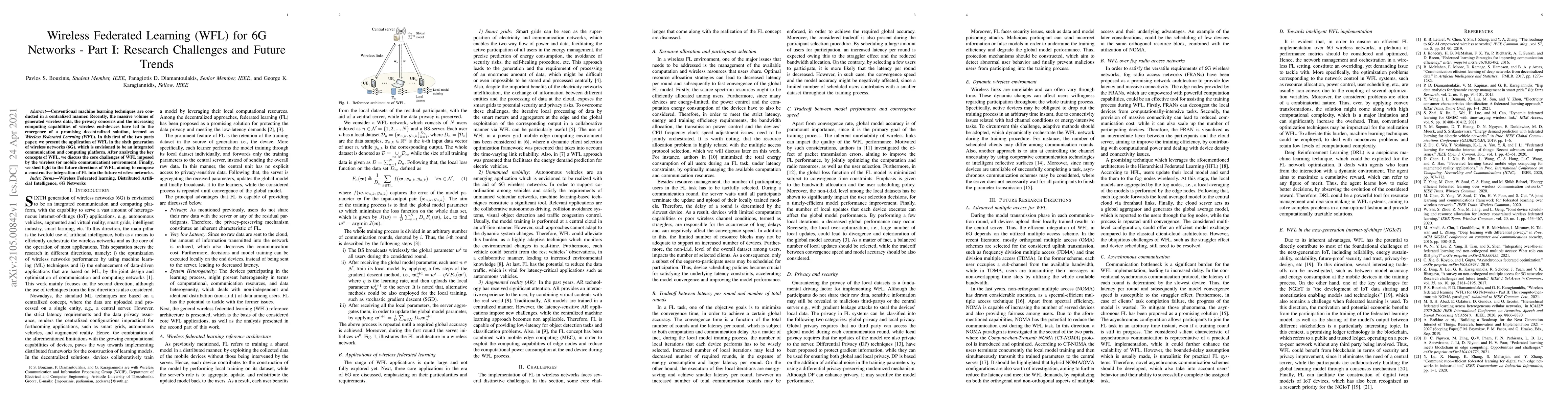 Conventional machine learning techniques are conducted in a centralized manner. Recently, the massive volume of generated wireless data, the privacy concerns and the increasing computing capabilities of wireless end-devices have led to the emergence of a promising decentralized solution, termed as Wireless Federated Learning (WFL). In this first of the two parts paper, we present the application of WFL in the sixth generation of wireless networks (6G), which is envisioned to be an integrated communication and computing platform. After analyzing the key concepts of WFL, we discuss the core challenges of WFL imposed by the wireless (or mobile communication) environment. Finally, we shed light to the future directions of WFL, aiming to compose a constructive integration of FL into the future wireless networks.