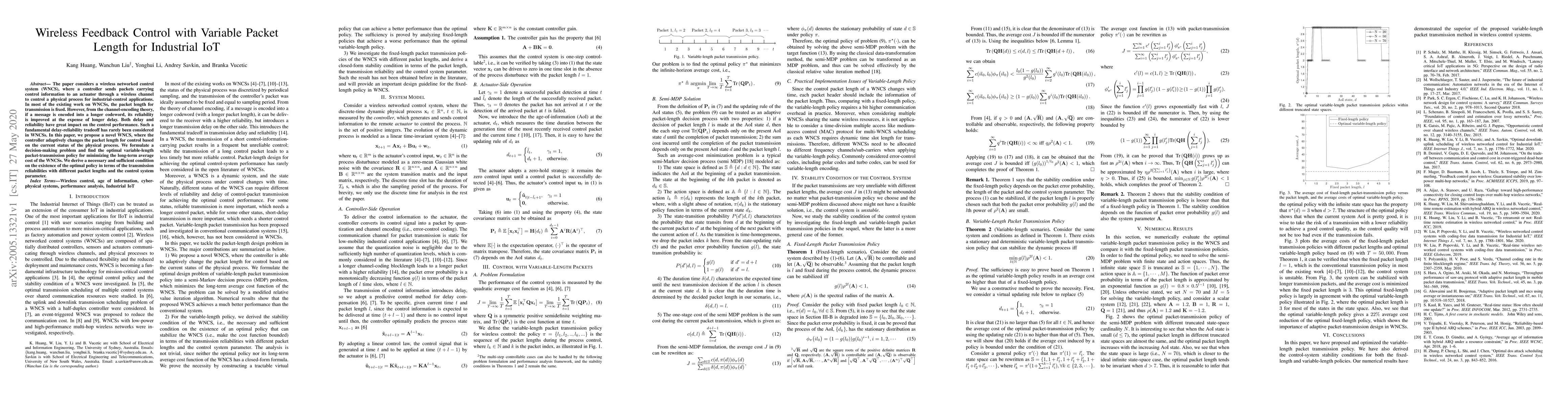 This paper proposes a novel wireless networked control system (WNCS) where the controller dynamically adjusts packet length to optimize control performance, balancing delay and reliability. The authors formulate a decision-making problem to find the optimal variable-length packet-transmission policy, deriving conditions for the existence of such an optimal policy.