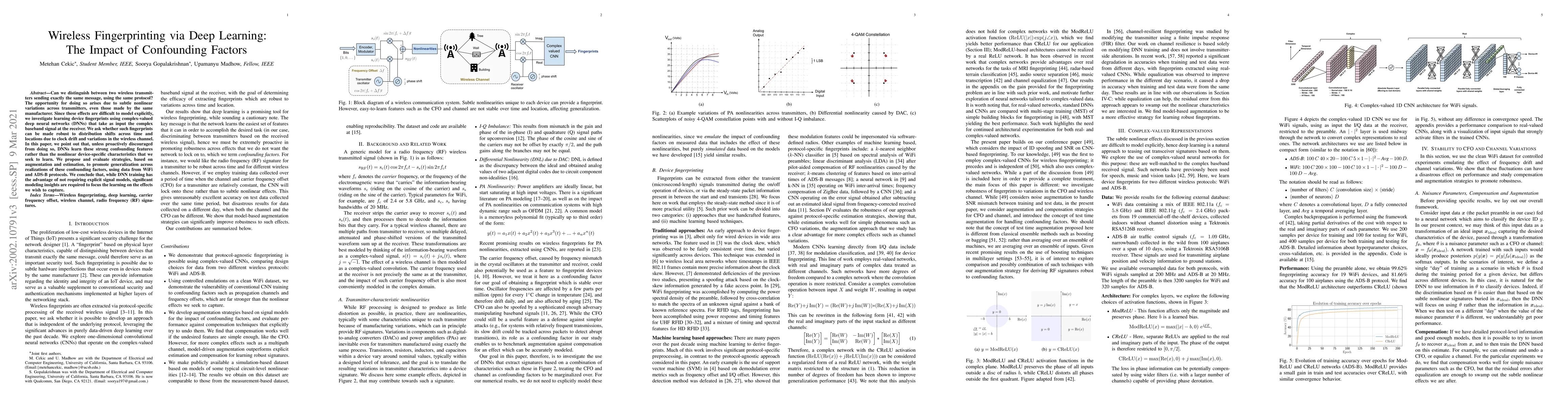 This paper explores the use of deep neural networks to distinguish between identical wireless transmitters by learning device fingerprints from complex baseband signals. It highlights the challenge of confounding factors like clock drift and channel variations, proposing methods to improve model robustness, and concludes that while DNNs are powerful, targeted modeling insights are crucial for focusing learning on desired device-specific characteristics.