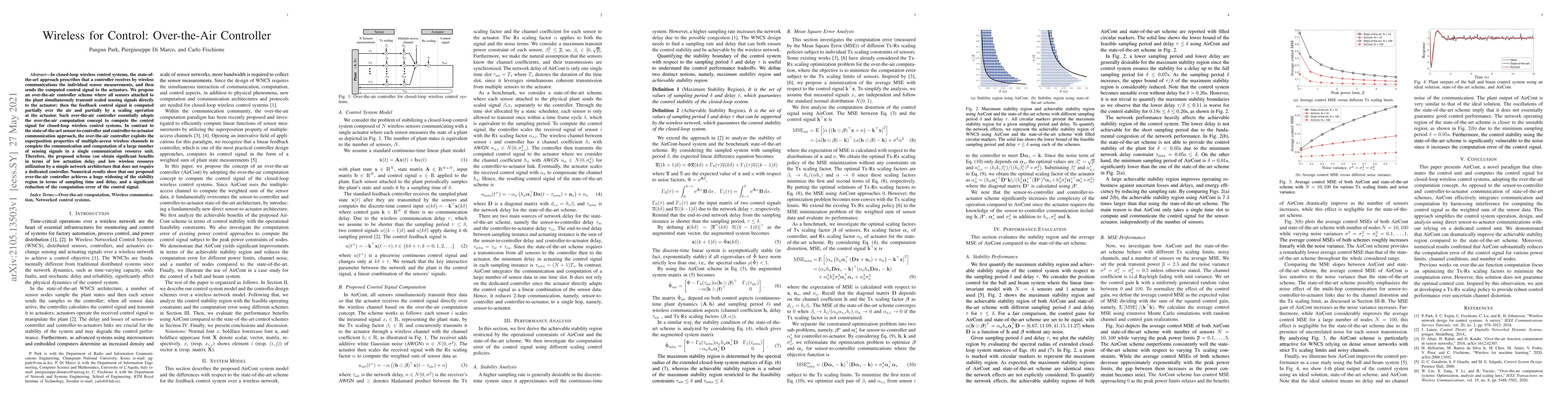 The paper proposes an over-the-air controller scheme for closed-loop wireless control systems that transmits sensor signals directly to actuators, computing the control signal partially over the air and partially at the actuator. This approach reduces actuation delay and wireless resource utilization, achieving a wider stability region and lower computation error compared to traditional methods.