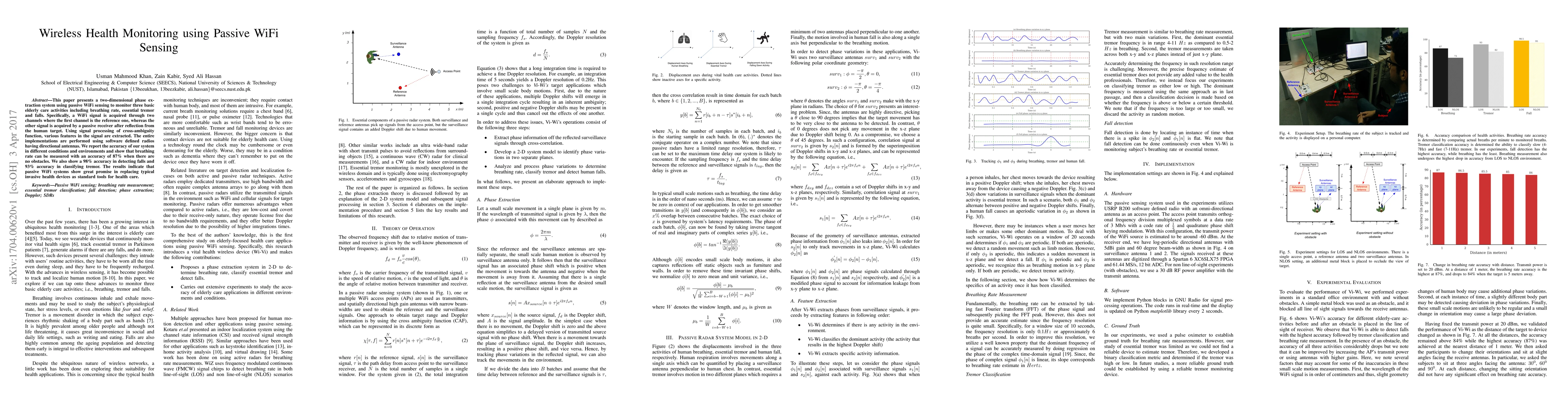 The paper introduces a two-dimensional phase extraction system using passive WiFi sensing for health monitoring, including signal processing techniques and a system model for detecting breathing rate, tremor, and falls.
