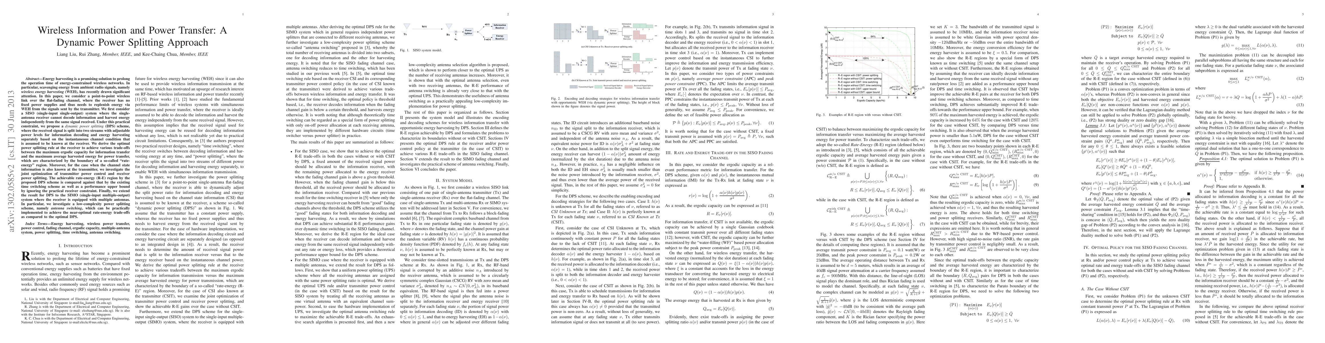 This paper proposes a dynamic power splitting scheme for wireless information and power transfer in a SISO system, where the receiver splits received signals for optimal information decoding and energy harvesting. The study extends the approach to SIMO systems and introduces a low-complexity antenna switching method.
