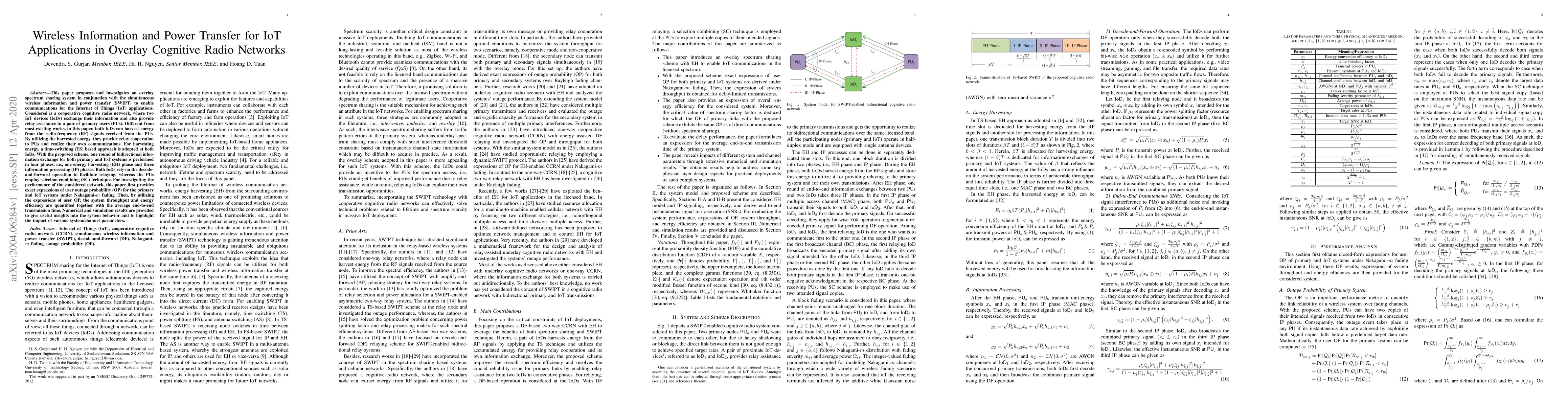 This paper proposes and investigates an overlay spectrum sharing system in conjunction with the simultaneous wireless information and power transfer (SWIPT) to enable communications for the Internet of Things (IoT) applications. Considered is a cooperative cognitive radio network, where two IoT devices (IoDs) exchange their information and also provide relay assistance to a pair of primary users (PUs). Different from most existing works, in this paper, both IoDs can harvest energy from the radio-frequency (RF) signals received from the PUs. By utilizing the harvested energy, they provide relay cooperation to PUs and realize their own communications. For harvesting energy, a time-switching (TS) based approach is adopted at both IoDs. With the proposed scheme, one round of bidirectional information exchange for both primary and IoT systems is performed in four phases, i.e., one energy harvesting (EH) phase and three information processing (IP) phases. Both IoDs rely on the decode-and-forward operation to facilitate relaying, whereas the PUs employ selection combining (SC) technique. For investigating the performance of the considered network, this paper first provides exact expressions of user outage probability (OP) for the primary and IoT systems under Nakagami-m fading. Then, by utilizing the expressions of user OP, the system throughput and energy efficiency are quantified together with the average end-to-end transmission time. Numerical and simulation results are provided to give useful insights into the system behavior and to highlight the impact of various system/channel parameters.