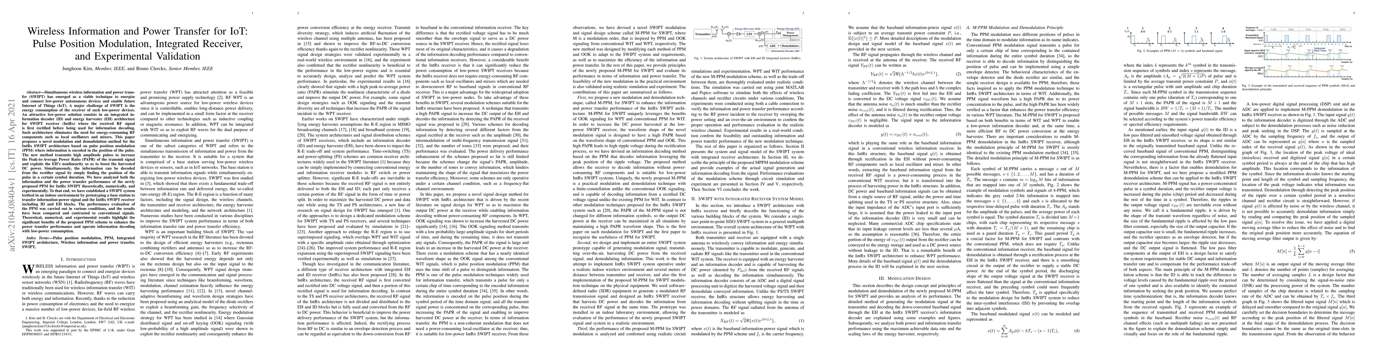 Simultaneous wireless information and power transfer (SWIPT) has emerged as a viable technique to energize and connect low-power autonomous devices and enable future Internet of Things (IoT). A major challenge of SWIPT is the energy consumption of the receiver of such low-power devices. An attractive low-power solution consists in an integrated information decoder (ID) and energy harvester (EH) architecture for SWIPT receiver (IntRx) where the received RF signal is first rectified before being used for information decoding. Such architecture eliminates the need for energy-consuming RF components such as local oscillators and mixers. This paper proposes a novel modulation and demodulation method for the IntRx SWIPT architecture based on pulse position modulation (PPM) where information is encoded in the position of the pulse. The new method transmits high amplitude pulses to increase the Peak-to-Average Power Ratio (PAPR) of the transmit signal and exploits the EH's nonlinearity so as to boost the harvested DC power. Simultaneously, the information can be decoded from the rectifier signal by simply finding the position of the pulse in a certain symbol duration. We have analyzed both the information and the power transfer performance of the newly proposed PPM for IntRx SWIPT theoretically, numerically, and experimentally. To that end, we have established a SWIPT system testbed in an indoor environment by prototyping a base station to transfer information-power signal and the IntRx SWIPT receiver including ID and EH blocks. The performance evaluation of the PPM was carried out in various conditions, and the results have been compared and contrasted to conventional signals. Theoretical, numerical, and experimental results highlight the significant benefits of the proposed PPM scheme to enhance the power transfer performance and operate information decoding with low-power consumption.
