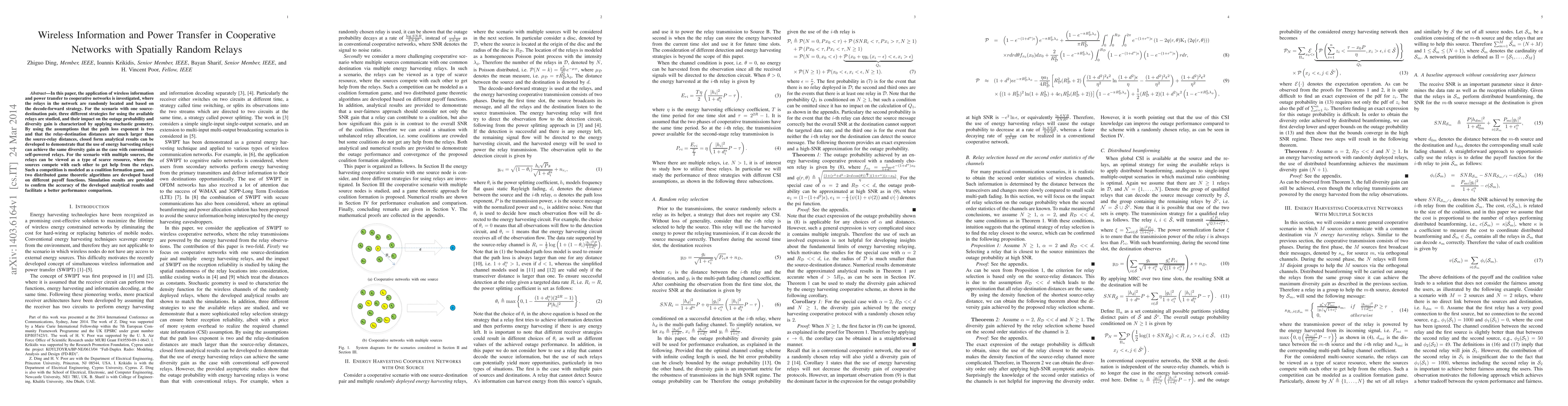 This paper explores wireless information and power transfer in cooperative networks with randomly located relays using decode-forward strategy. It develops analytical results showing that energy harvesting relays can achieve the same diversity gain as self-powered relays, and models relay competition among multiple sources as a coalition formation game with distributed game theoretic algorithms.