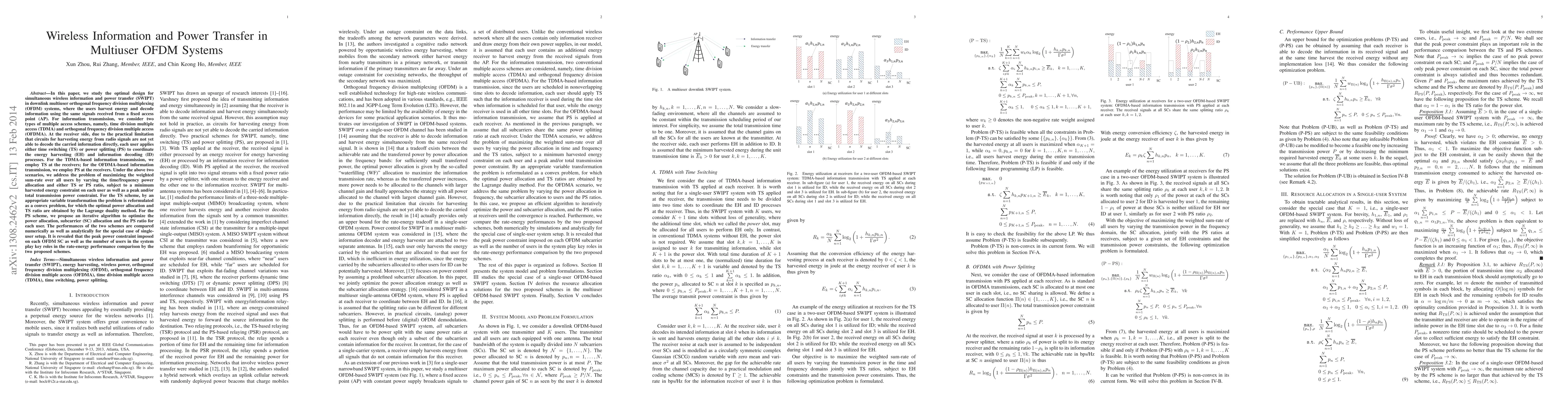 This paper investigates optimal design for SWIPT in multiuser OFDM systems, employing TDMA and OFDMA for information transmission. It proposes TS and PS schemes for energy harvesting and information decoding, optimizing power allocation and ratios to maximize weighted sum-rate under energy and power constraints, and compares their performance.