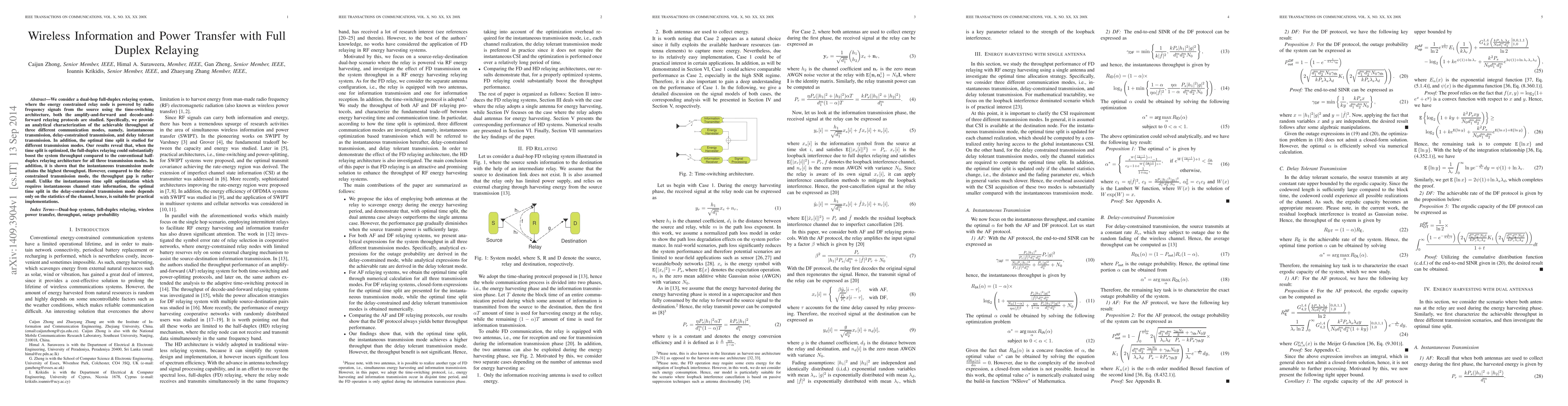 This paper explores a dual-hop full-duplex relaying system where the relay is powered by the source and studies both amplify-and-forward and decode-and-forward protocols. It finds that optimized time splitting can significantly boost throughput compared to half-duplex relaying, with instantaneous transmission achieving the highest throughput, though the gap to delay-constrained transmission is minimal.
