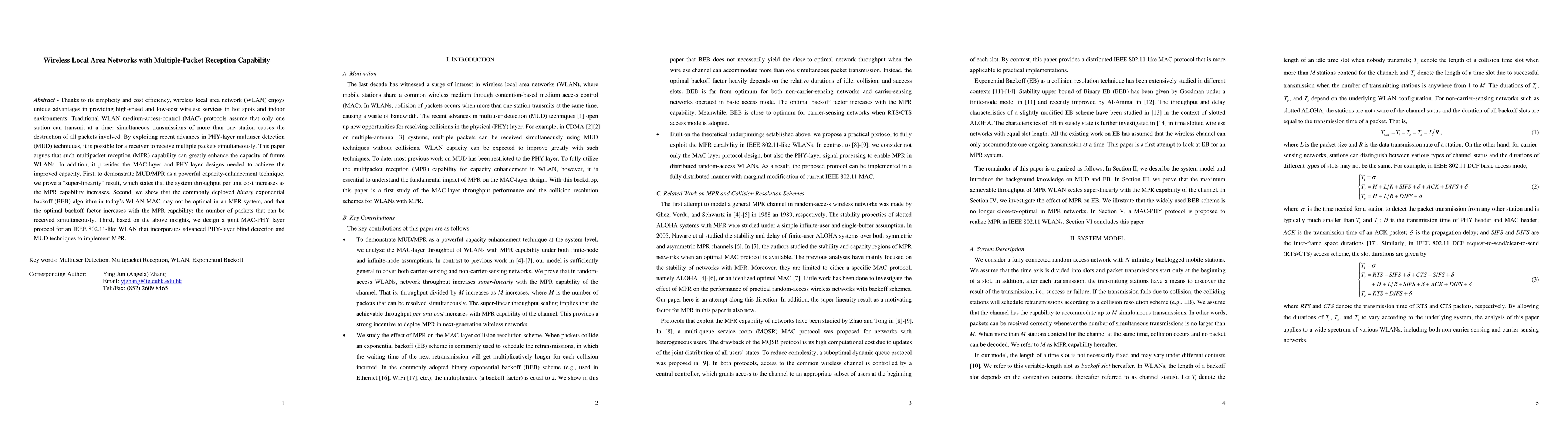 This paper explores the enhancement of wireless local area networks (WLAN) through the implementation of multipacket reception (MPR) using advanced PHY-layer multiuser detection (MUD) techniques. It demonstrates that MPR can significantly boost network capacity and proposes a new joint MAC-PHY layer protocol that optimizes the binary exponential backoff algorithm for MPR systems.