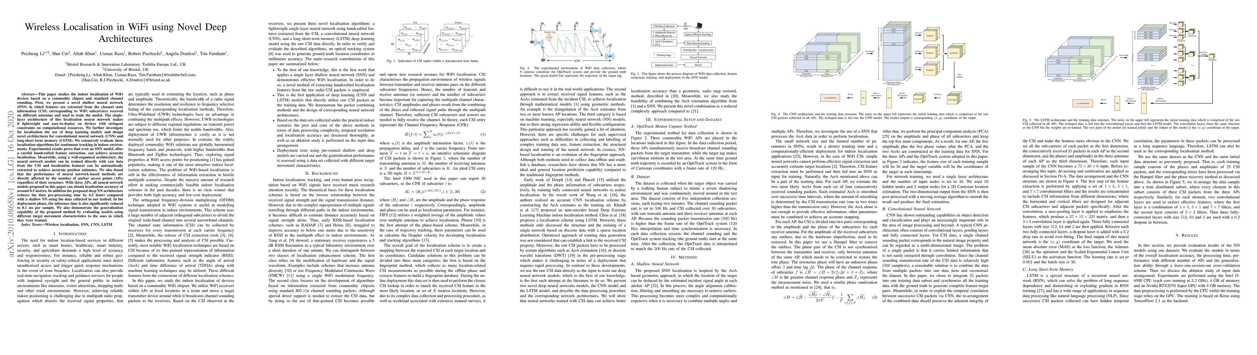This paper proposes novel deep learning architectures for WiFi-based indoor localisation using channel state information (CSI). It demonstrates that shallow neural networks (SNN) and deep models like CNN and LSTM can achieve high accuracy, with the deep architectures reducing pre-processing time and inference time significantly.