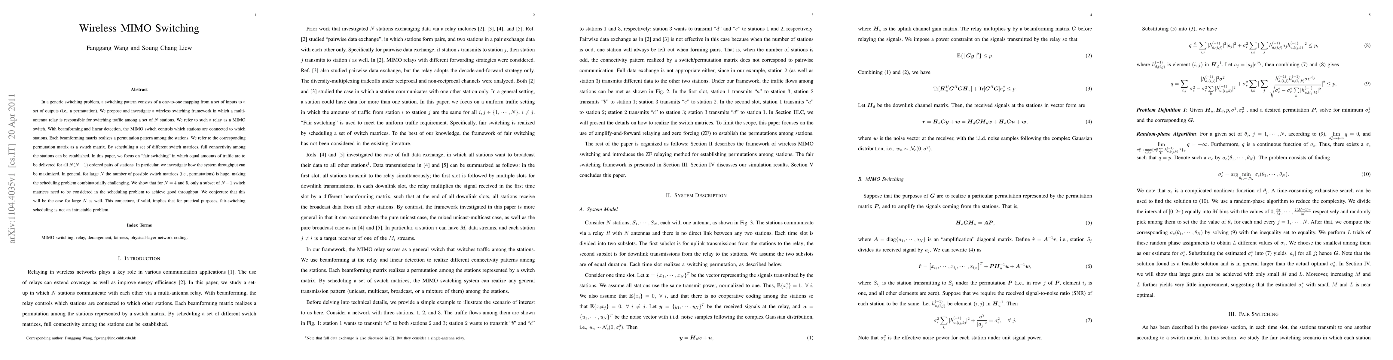 In a generic switching problem, a switching pattern consists of a one-to-one mapping from a set of inputs to a set of outputs (i.e., a permutation). We propose and investigate a wireless switching framework in which a multi-antenna relay is responsible for switching traffic among a set of $N$ stations. We refer to such a relay as a MIMO switch. With beamforming and linear detection, the MIMO switch controls which stations are connected to which stations. Each beamforming matrix realizes a permutation pattern among the stations. We refer to the corresponding permutation matrix as a switch matrix. By scheduling a set of different switch matrices, full connectivity among the stations can be established. In this paper, we focus on "fair switching" in which equal amounts of traffic are to be delivered for all $N(N-1)$ ordered pairs of stations. In particular, we investigate how the system throughput can be maximized. In general, for large $N$ the number of possible switch matrices (i.e., permutations) is huge, making the scheduling problem combinatorially challenging. We show that for N=4 and 5, only a subset of $N-1$ switch matrices need to be considered in the scheduling problem to achieve good throughput. We conjecture that this will be the case for large $N$ as well. This conjecture, if valid, implies that for practical purposes, fair-switching scheduling is not an intractable problem.