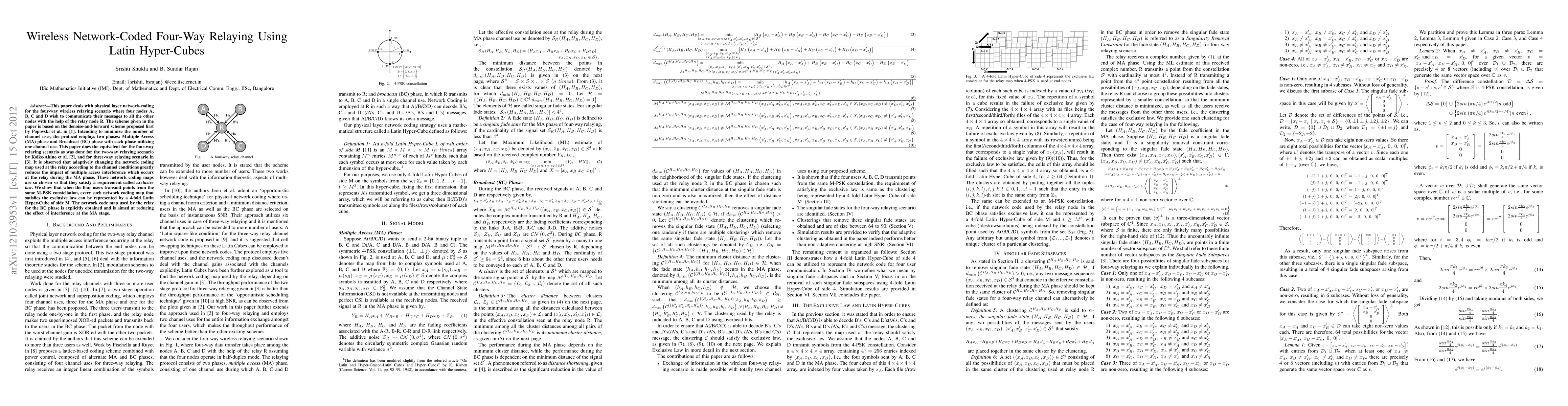This paper proposes a wireless network-coding scheme for four-way relaying using Latin Hyper-Cubes to minimize channel uses and reduce interference. The scheme employs a denoise-and-forward approach with two phases, and adaptively selects network coding maps based on channel conditions to satisfy the exclusive law.