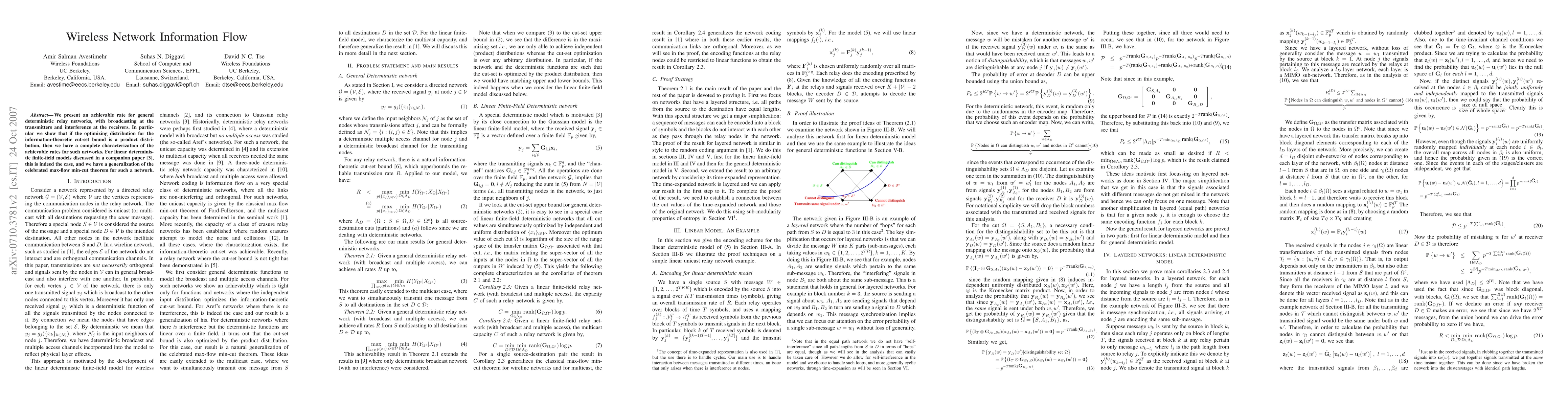 The paper presents an analysis of wireless relay networks using a deterministic model, focusing on broadcasting at transmitters and interference at receivers. It characterizes achievable rates for general deterministic relay networks, specifically when the optimizing distribution for the information-theoretic cut-set bound is a product distribution.
