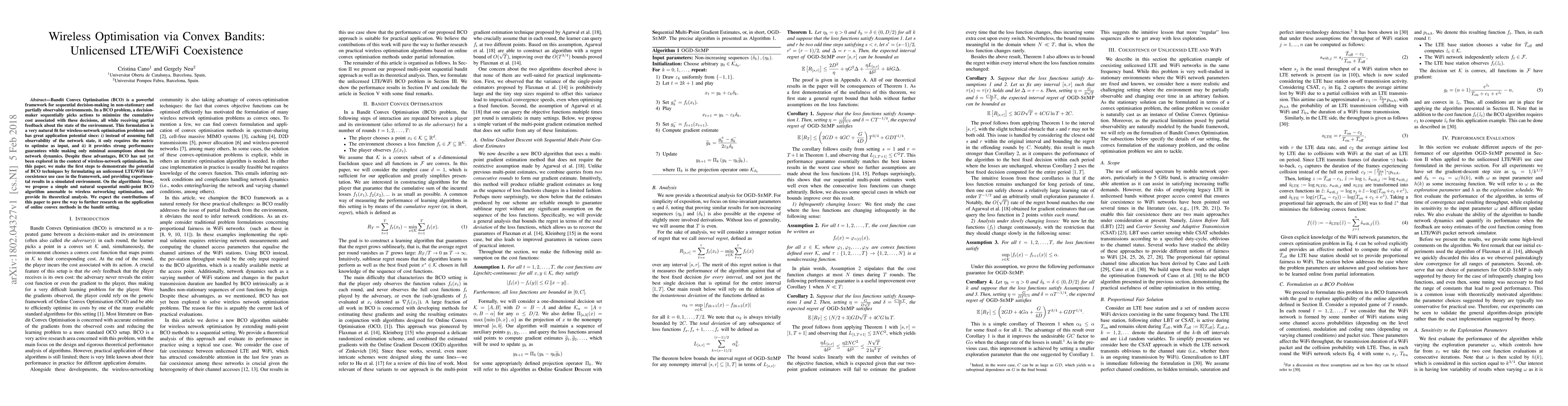 This paper introduces Bandit Convex Optimisation (BCO) to optimise unlicensed LTE/WiFi coexistence, demonstrating its potential through a sequential multi-point BCO algorithm. The proposed method provides strong performance guarantees with minimal assumptions, offering a novel approach to wireless network optimisation.