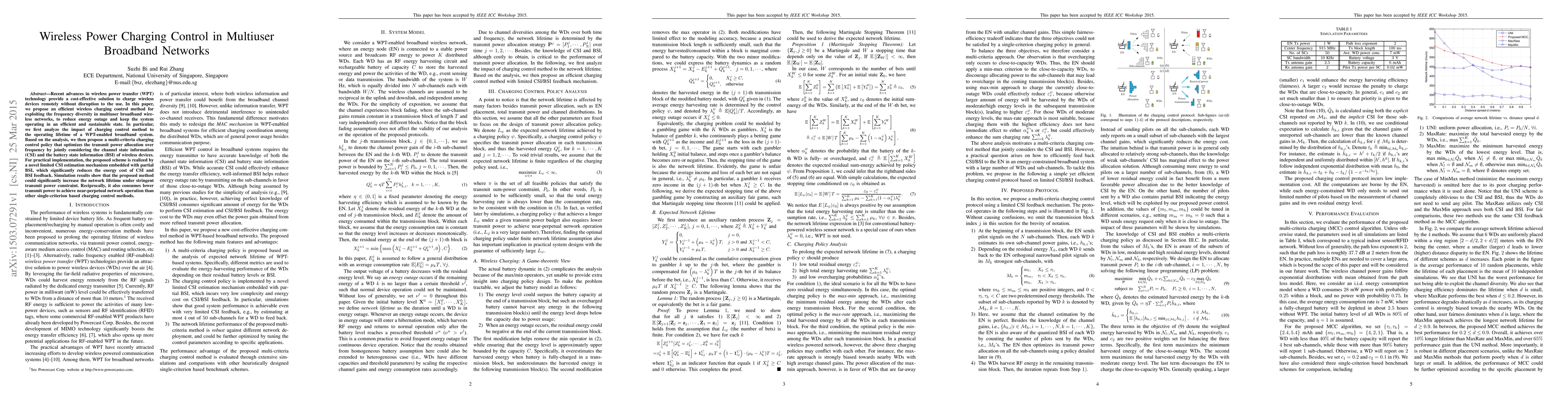 This paper proposes an efficient wireless charging control method for multiuser broadband networks, leveraging frequency diversity to reduce energy outage and enhance system sustainability. The method optimizes transmit power allocation by considering channel and battery state information, and achieves near-perpetual network operation with lower transmit power compared to single-criterion methods.