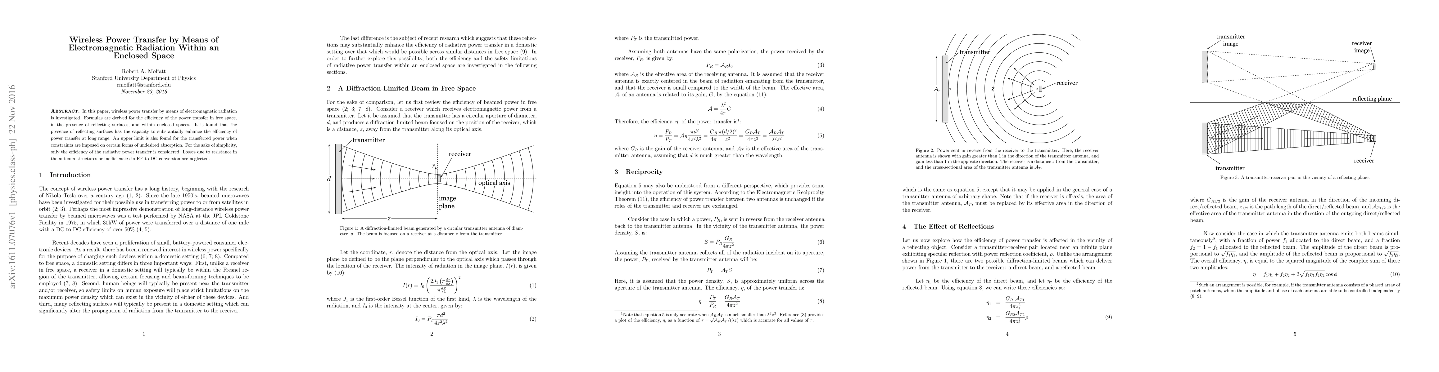 This paper explores wireless power transfer via electromagnetic radiation, deriving efficiency formulas for free space, reflecting surfaces, and enclosed spaces. It finds that reflective surfaces significantly boost long-range transfer efficiency, while also identifying an upper limit for power transfer under absorption constraints. Resistance and conversion inefficiencies are not considered.