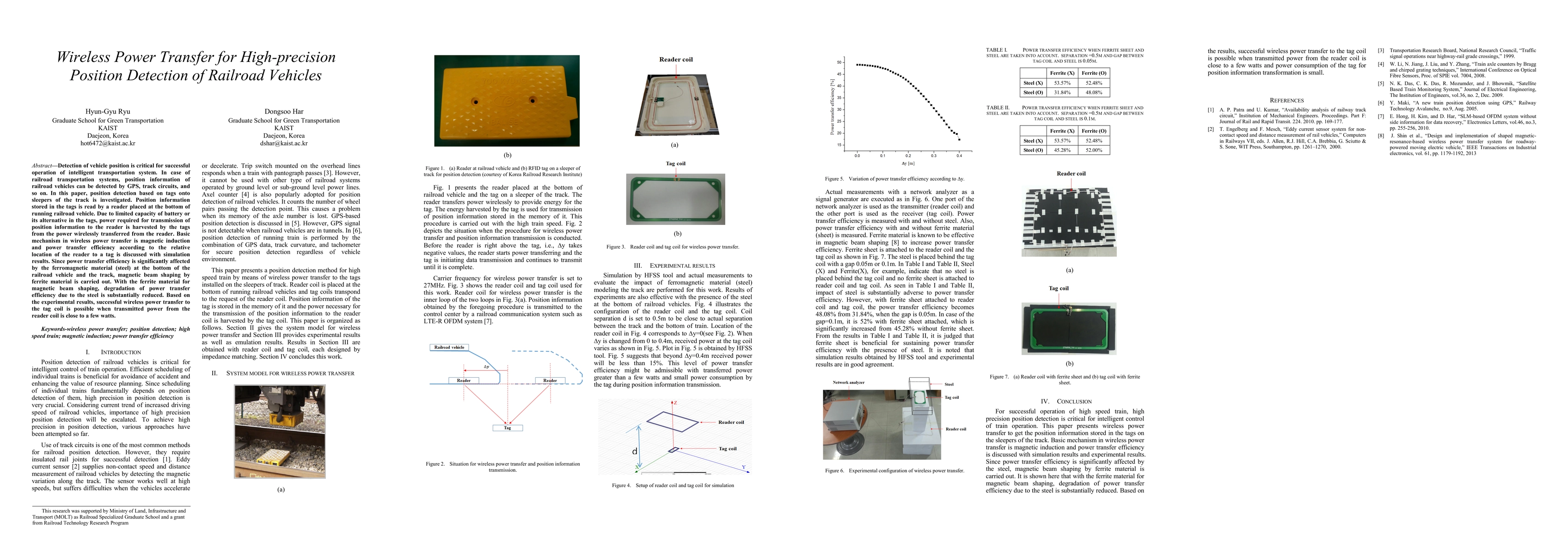 Detection of vehicle position is critical for successful operation of intelligent transportation system. In case of railroad transportation systems, position information of railroad vehicles can be detected by GPS, track circuits, and so on. In this paper, position detection based on tags onto sleepers of the track is investigated. Position information stored in the tags is read by a reader placed at the bottom of running railroad vehicle. Due to limited capacity of battery or its alternative in the tags, power required for transmission of position information to the reader is harvested by the tags from the power wirelessly transferred from the reader. Basic mechanism in wireless power transfer is magnetic induction and power transfer efficiency according to the relative location of the reader to a tag is discussed with simulation results. Since power transfer efficiency is significantly affected by the ferromagnetic material (steel) at the bottom of the railroad vehicle and the track, magnetic beam shaping by ferrite material is carried out. With the ferrite material for magnetic beam shaping, degradation of power transfer efficiency due to the steel is substantially reduced. Based on the experimental results, successful wireless power transfer to the tag coil is possible when transmitted power from the reader coil is close to a few watts.