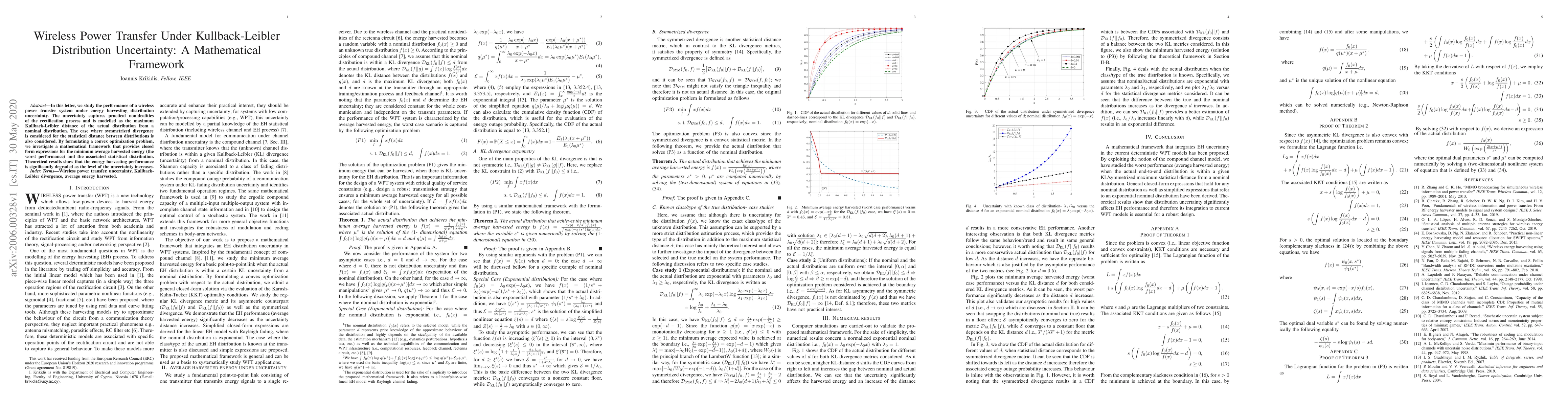 A study investigates wireless power transfer under uncertainty in energy harvesting distributions, finding that increasing uncertainty significantly degrades performance. A mathematical framework is proposed to optimize energy harvesting under Kullback-Leibler distance uncertainty.