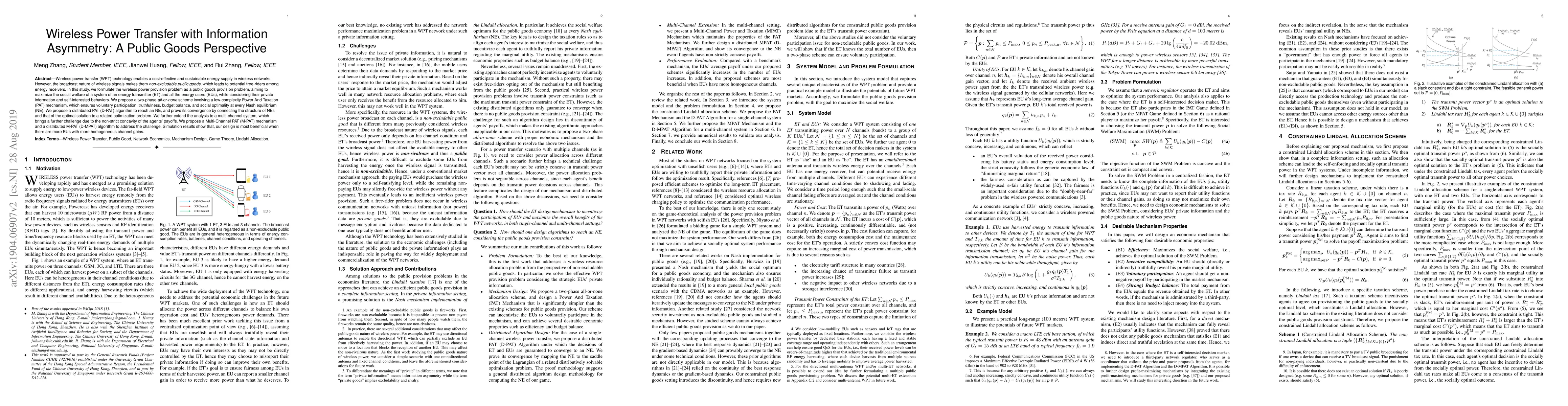 Wireless power transfer (WPT) technology enables a cost-effective and sustainable energy supply in wireless networks. However, the broadcast nature of wireless signals makes them non-excludable public goods, which leads to potential free-riders among energy receivers. In this study, we formulate the wireless power provision problem as a public goods provision problem, aiming to maximize the social welfare of a system of an energy transmitter (ET) and all the energy users (EUs), while considering their private information and self-interested behaviors. We propose a two-phase all-or-none scheme involving a low-complexity Power And Taxation (PAT) mechanism, which ensures voluntary participation, truthfulness, budget balance, and social optimality at every Nash equilibrium (NE). We propose a distributed PAT (D-PAT) algorithm to reach an NE, and prove its convergence by connecting the structure of NEs and that of the optimal solution to a related optimization problem. We further extend the analysis to a multi-channel system, which brings a further challenge due to the non-strict concavity of the agents' payoffs. We propose a Multi-Channel PAT (M-PAT) mechanism and a distributed M-PAT (D-MPAT) algorithm to address the challenge. Simulation results show that our design is most beneficial when there are more EUs with more homogeneous channel gains.