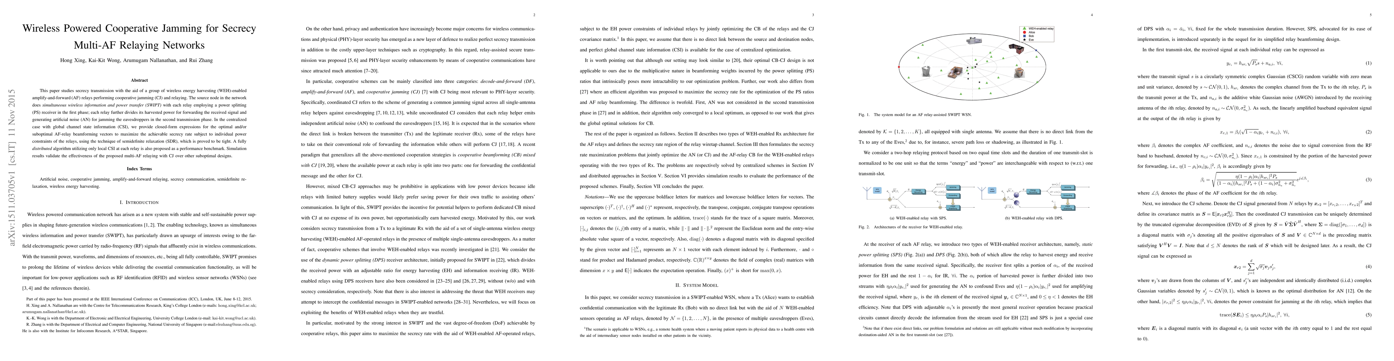 This paper explores secrecy transmission in wireless networks using energy harvesting relays that perform cooperative jamming and amplify-and-forward relaying. It proposes optimal beamforming techniques and a distributed algorithm to maximize the secrecy rate, validated by simulation results.