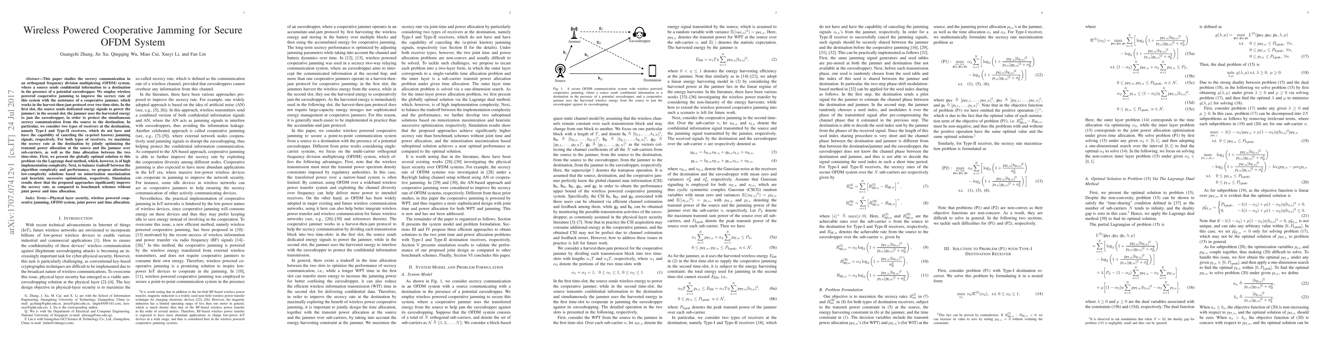 This paper investigates wireless powered cooperative jamming to enhance the secrecy rate in an OFDM system with a source communicating confidential information to a destination in the presence of an eavesdropper. It proposes a two-time slot harvest-then-jam protocol and presents globally optimal and low-complexity solutions to maximize the secrecy rate for both Type-I and Type-II receivers.