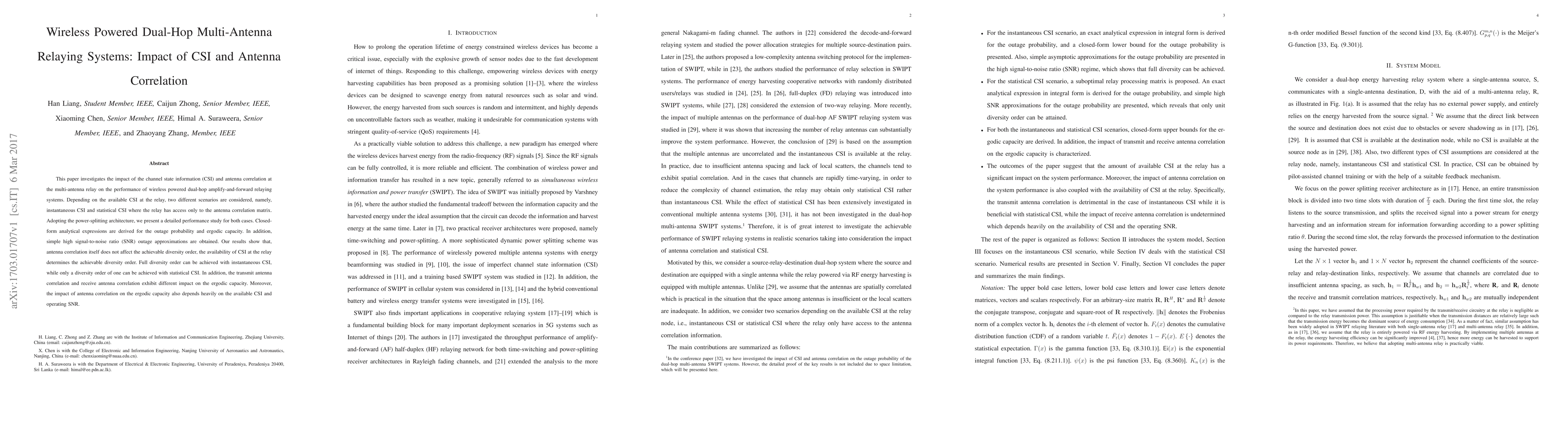 This paper examines how channel state information (CSI) and antenna correlation affect wireless powered dual-hop relay systems, deriving analytical expressions for outage probability and ergodic capacity. It finds that full diversity is achievable with instantaneous CSI, while statistical CSI limits diversity to order one. Antenna correlation impacts ergodic capacity differently based on available CSI and SNR.