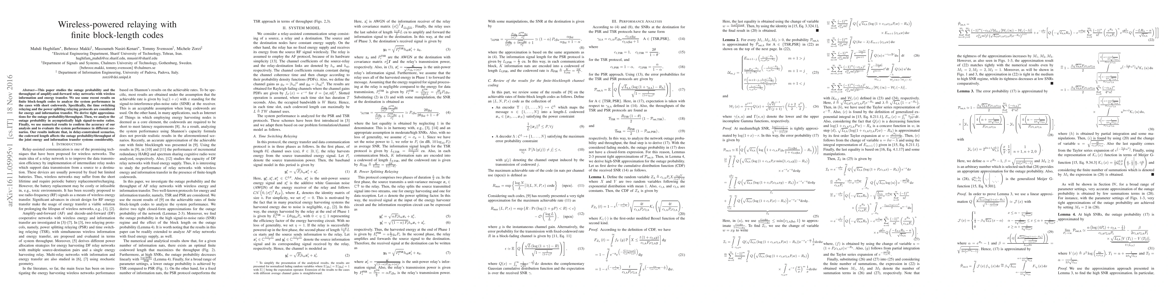 This paper studies the outage probability and the throughput of amplify-and-forward relay networks with wireless information and energy transfer. We use some recent results on finite block-length codes to analyze the system performance in the cases with short codewords. Specifically, the time switching relaying and the power splitting relaying protocols are considered for energy and information transfer. We derive tight approximations for the outage probability/throughput. Then, we analyze the outage probability in asymptotically high signal-to-noise ratios. Finally, we use numerical results to confirm the accuracy of our analysis and to evaluate the system performance in different scenarios. Our results indicate that, in delay-constrained scenarios, the codeword length affects the outage probability/throughput of the joint energy and information transfer systems considerably.