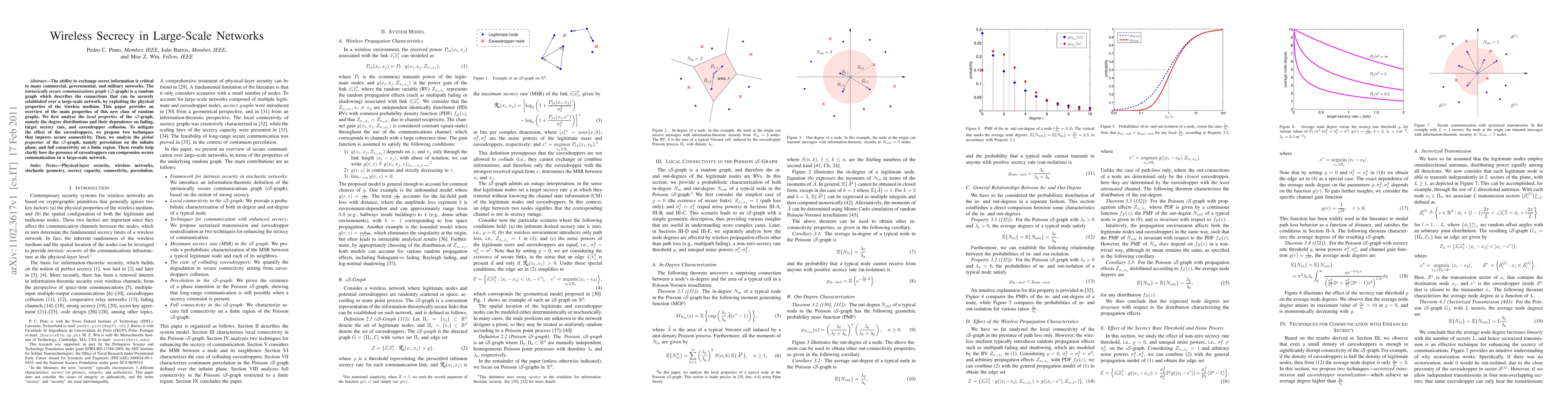 This paper explores the intrinsically secure communications graph (iS-graph) for secure wireless communications in large-scale networks, analyzing its local and global properties. It proposes techniques to enhance secure connectivity and discusses the impact of eavesdroppers on network security.